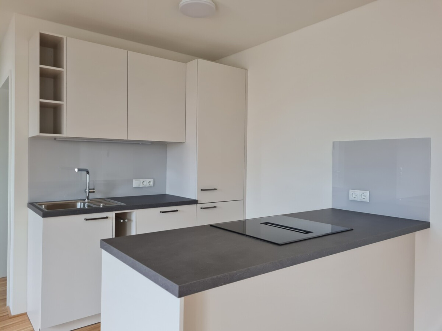Der harmonische Mix aus hochwertigen Fliesen- und Parkettböden verleiht den Räumen eine besondere Eleganz. Die moderne Einbauküche lädt dazu ein, kulinarische Kreationen zu verwirklichen und gesellige Abende im Kreise der Familie oder mit Freunden zu verbringen.