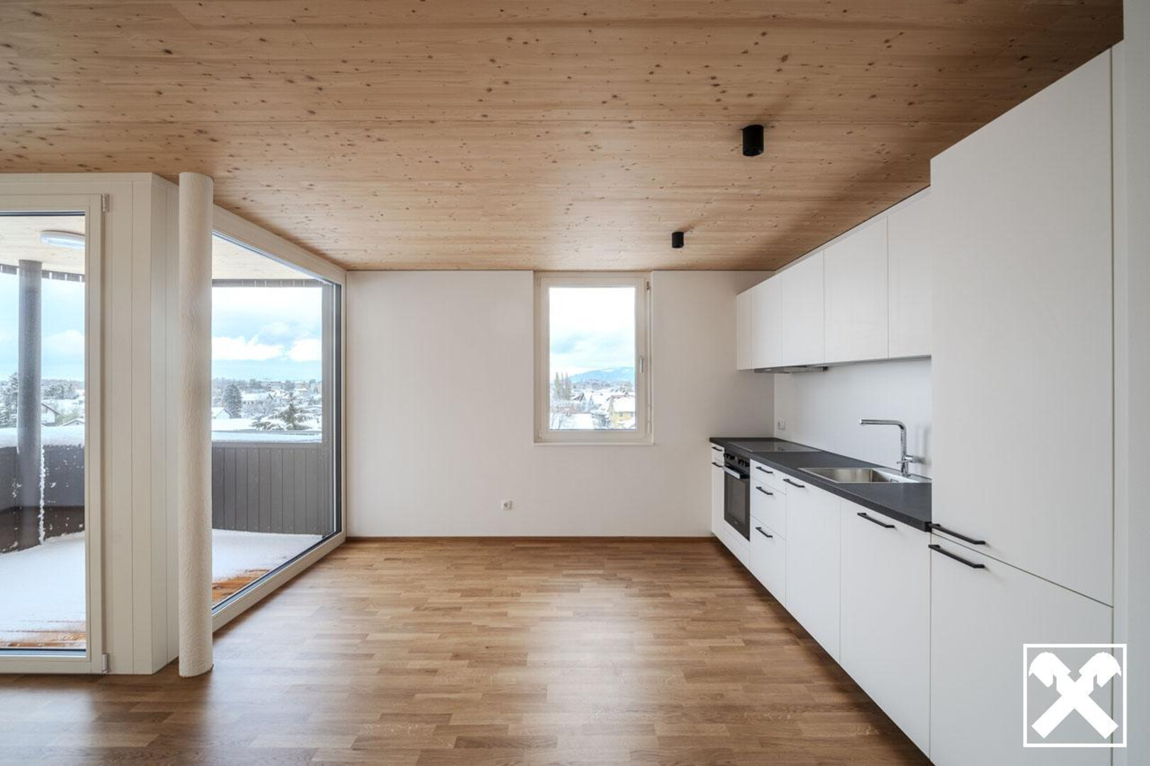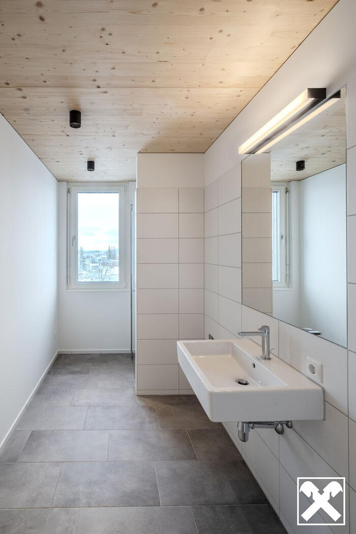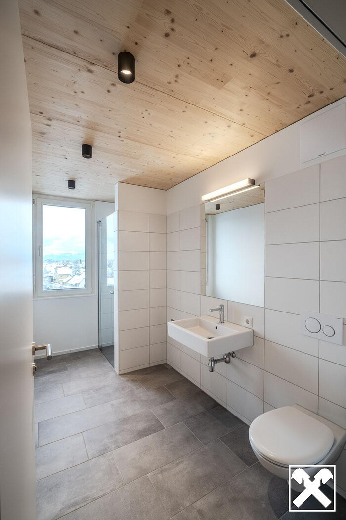 Die natürlichen Materialien im ganzen Haus und in den einzelnen Wohnungen, geben jedem der Eintritt ein tolles Gefühl. Über die Holzdecken verteilen die Deckenspots ihr Licht, sodass Sie keine Lampen mehr montieren müssen.