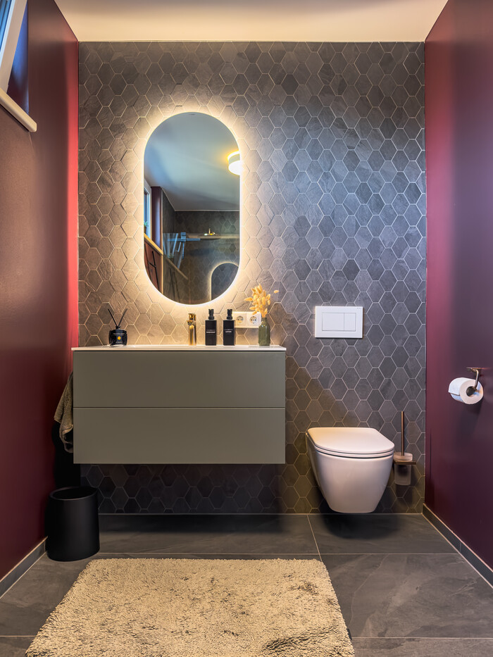 Das stilvolle Badezimmer mit Walk-In Dusche, edlen Materialien und indirekter Beleuchtung unterstreicht den gehobenen Anspruch. Maßgefertigte Einbauschränke vom Tischler bieten optimalen Stauraum und runden das stimmige Wohnkonzept ab.