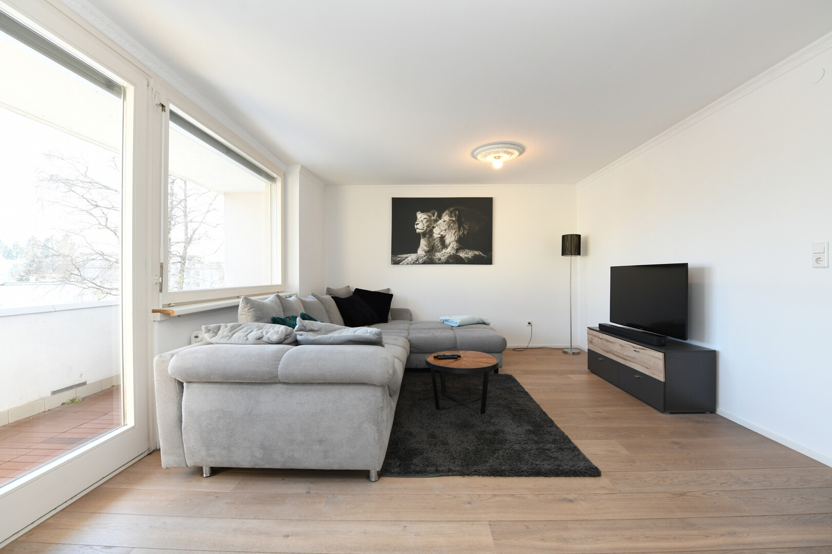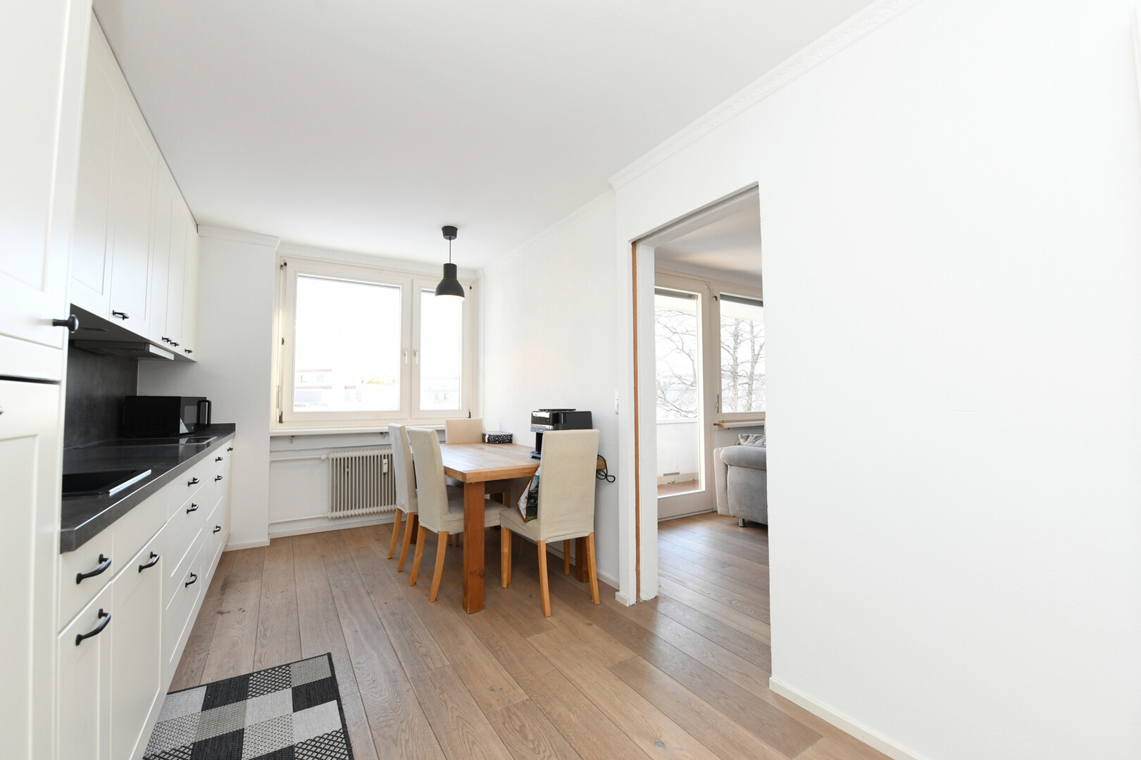 Der helle Wohnbereich schafft eine freundliche Wohnatmosphäre und bietet direkten Zugang zum Balkon, der zum Entspannen im Freien einlädt. Zwei weitere Zimmer lassen sich flexibel als Schlaf-, Kinder- oder Arbeitszimmer nutzen.