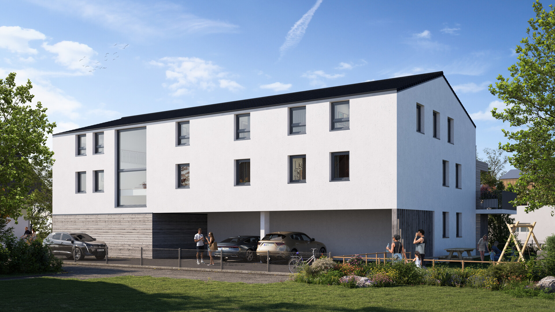 Ergänzt wird die Wohnanlage durch ausreichend überdachte Stellplätze für PKW, Abstellmöglichkeiten für Fahrräder im Erdgeschoss und einem ansprechend gestalteten Außenbereich mit Spiel- und Begegnungsflächen für jung und alt. Ein Personenaufzug garantiert die Barrierefreiheit der einzelnen Wohnungen.