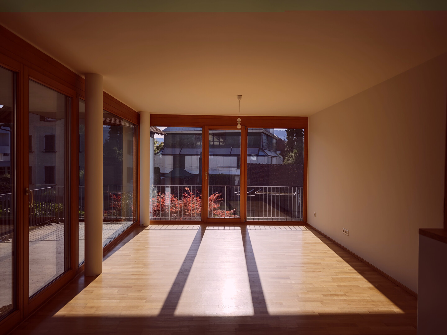 Durch die raumhohen Fensterfronten im Süden und Westen, sowie Fenster nach Osten im WC, dem Bad und der Wohnküche werden Sie den ganzen Tag von der Sonne begleitet. Der große überdachte Balkon erweitert ihren Wohnraum und lädt dazu ein, sich in frischer Luft auszuruhen und die Abendstimmungen sowie den Blick in die umgebenden Gärten zu genießen.