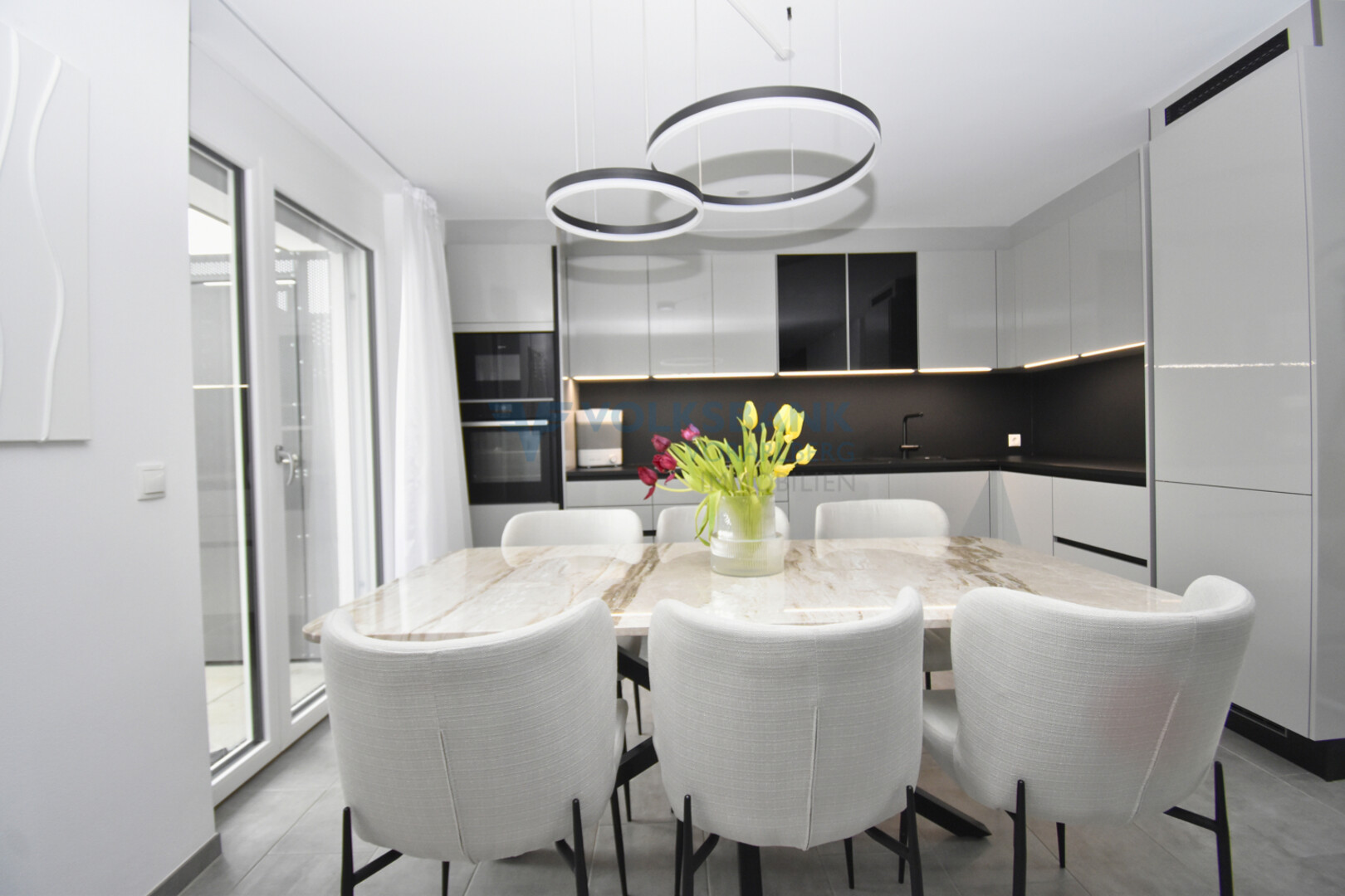 Beim Betreten der Wohnung erwartet Sie eine einladende Atmosphäre. Die stilvolle Einbauküche lädt zum Kochen ein und die hochwertigen Böden aus Fliesen und Vinyl schaffen ein nobles Ambiente.