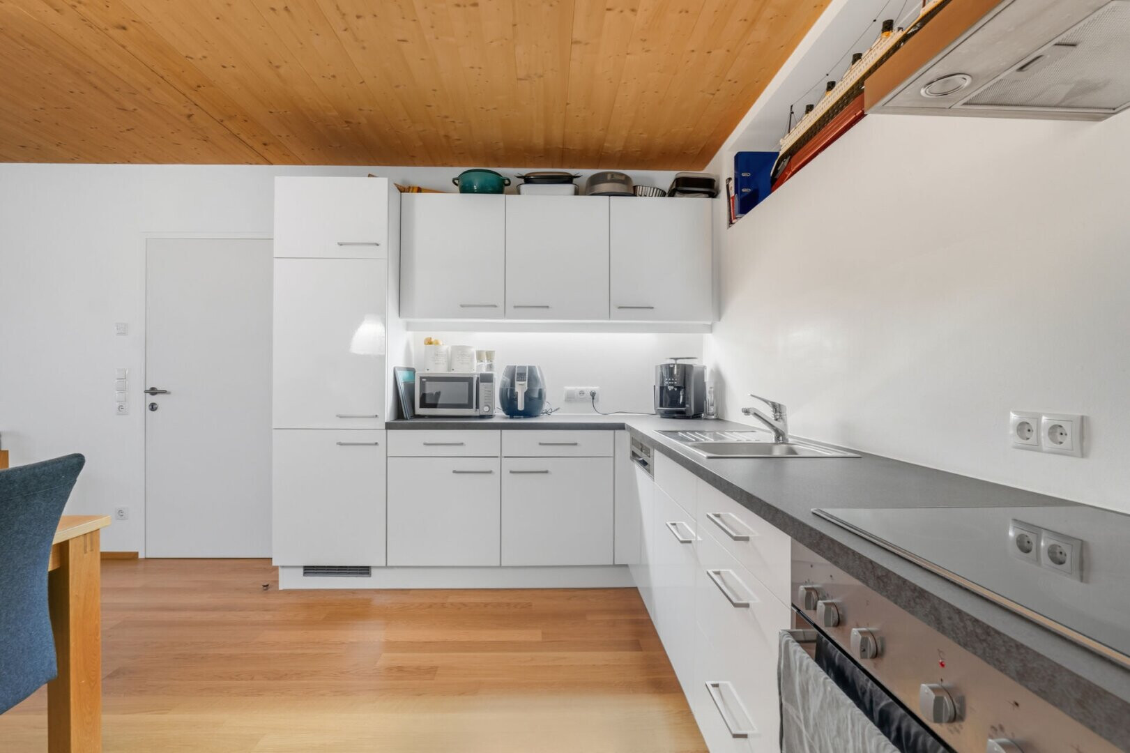 Der offen gestaltete Wohnbereich mit integrierter Küche sorgt für ein großzügiges Raumgefühl. Die Einbauküche ist funktional in den Wohnraum integriert.