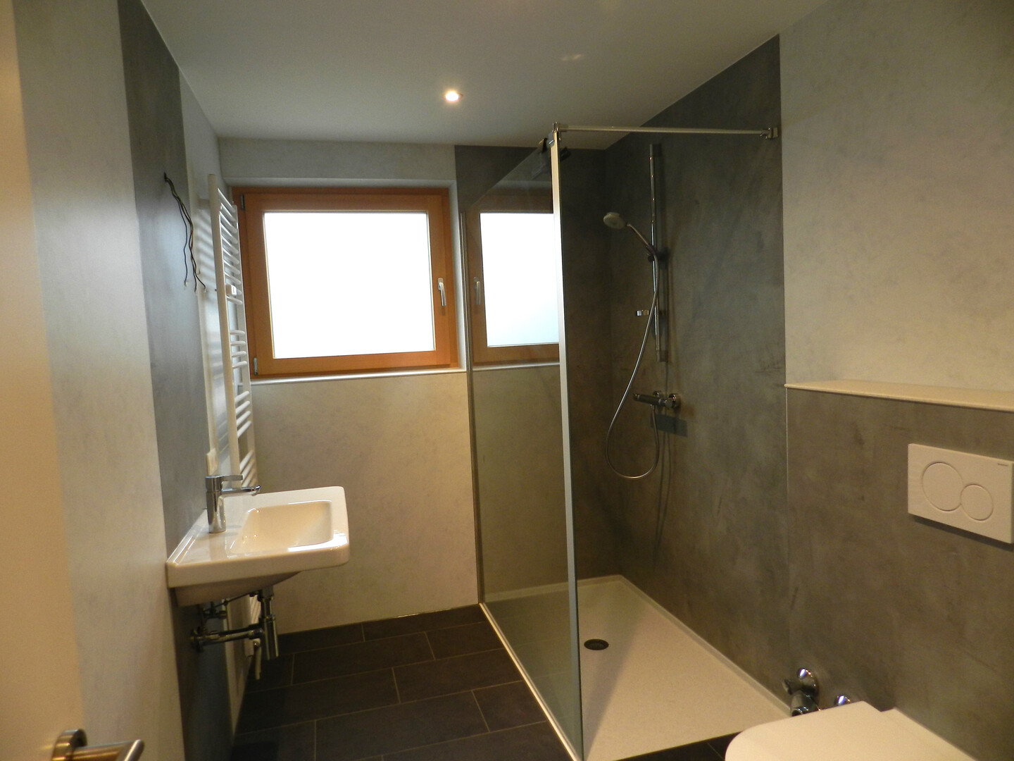 Badezimmer mit begehbarer Dusche, WC und Waschmaschinenanschluss