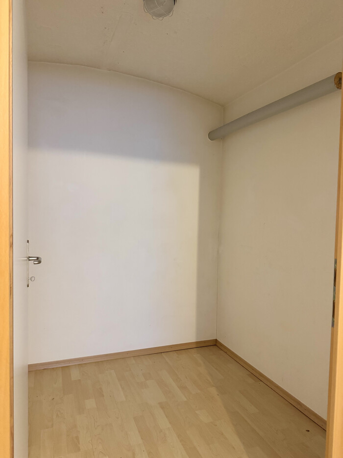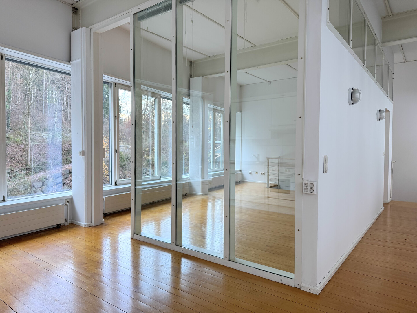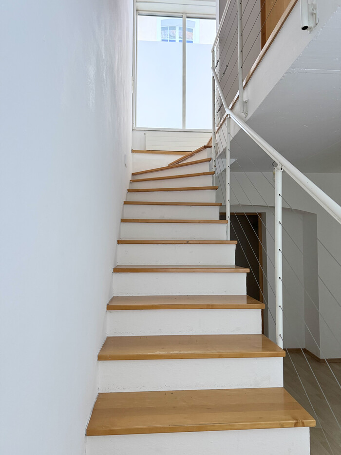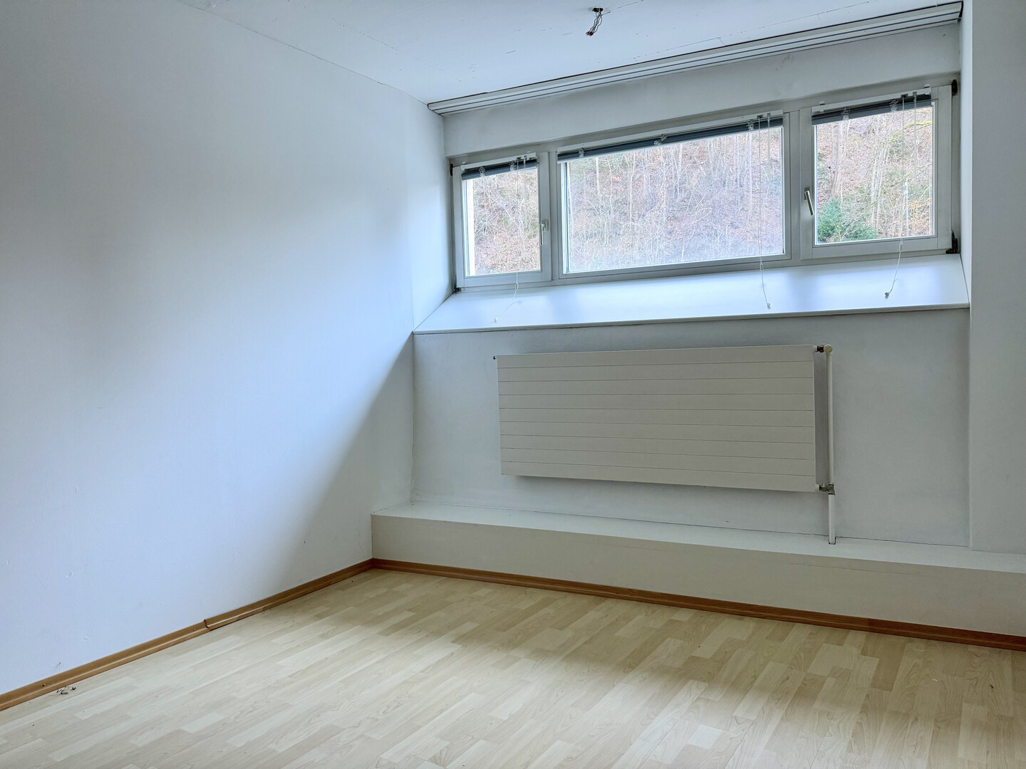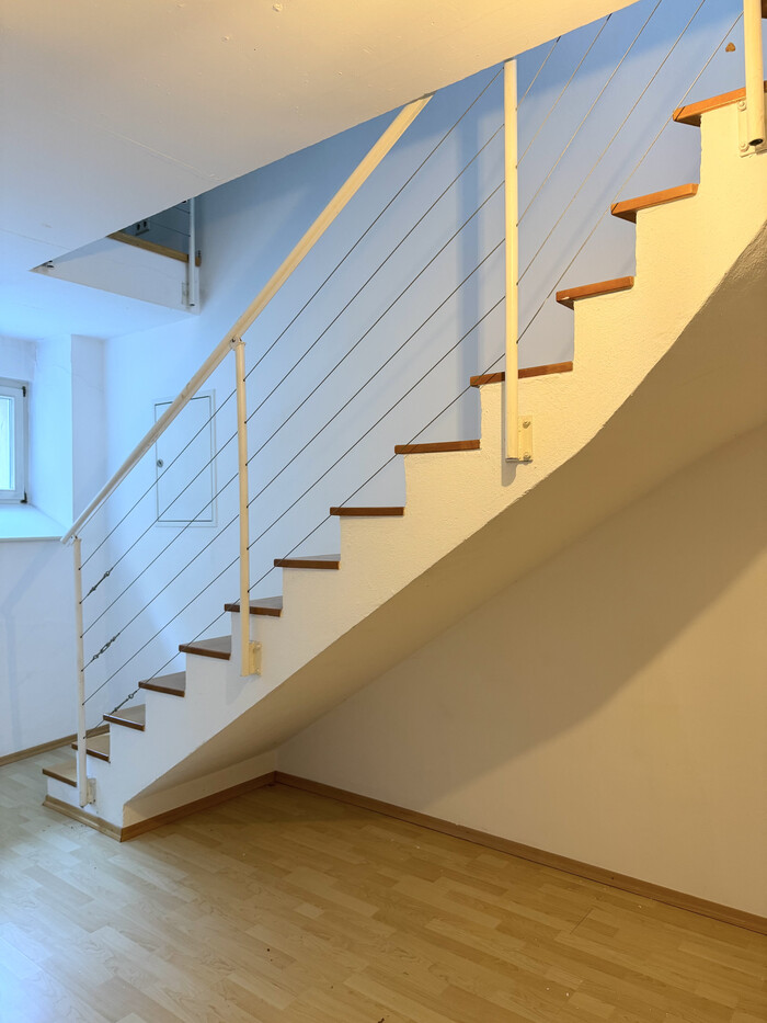 Eine Treppe führt in den unteren Bereich, in dem sich ein Badezimmer mit Wanne, Dusche und WC sowie ein separates WC befinden. Ein Schlafzimmer sowie ein verglastes Arbeitszimmer und ein Abstellraum komplettieren das Raumangebot.