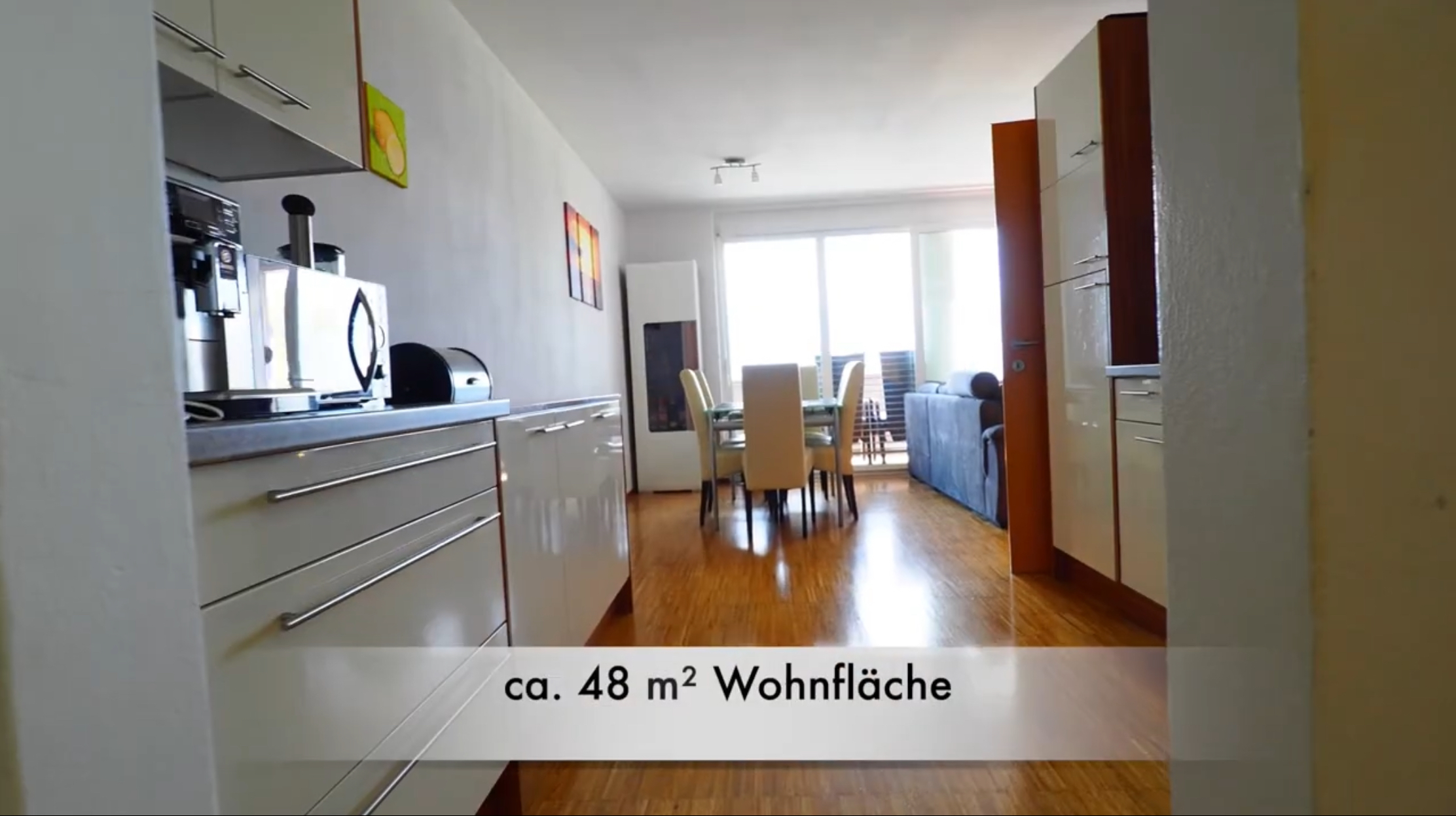 Eingebaute Garderobe, moderne Einbauküche mit Essbereich, komplettes Badezimmer mit Waschmaschinenanschluss, grosses Wohnzimmer mit Zugang auf den westseitigen Balkon, Schlafzimmer. Eigener Autoabstellplatz direkt vor der Eingangstüre und zugehöriges Aussenlager.