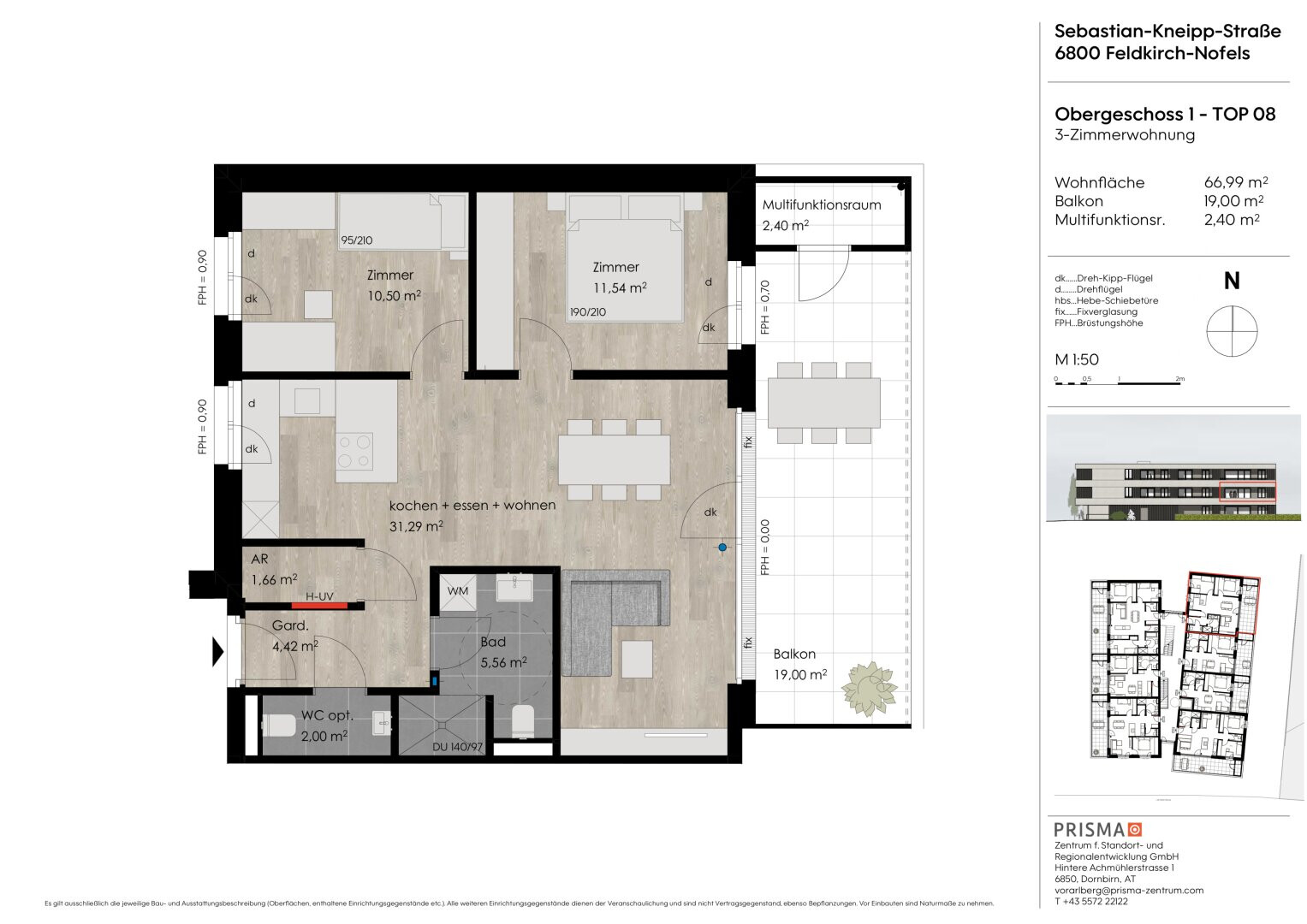 Die durchdachte Planung des Projekts stammt von den renommierten Aicher Architekten aus Dornbirn, die für innovative und nachhaltige Architektur stehen. Die hochwertige Architektur des Wohnprojekts in der Sebastian-Kneipp-Straße 8 bietet 2- bis 4-Zimmer-Wohnungen (40–83 m²) mit flexibel anpassbaren Grundrissen und einer Raumhöhe von 250 cm. Ein lichtdurchflutetes, innenliegendes Treppenhaus sorgt für ein helles Ambiente. Großzügige Wohn-/Essbereiche mit der Möglichkeit für eine Kochinsel, Fußbodenkühlung und einer energieeffizienten Erdsonden-Wärmepumpe runden das Konzept ab.