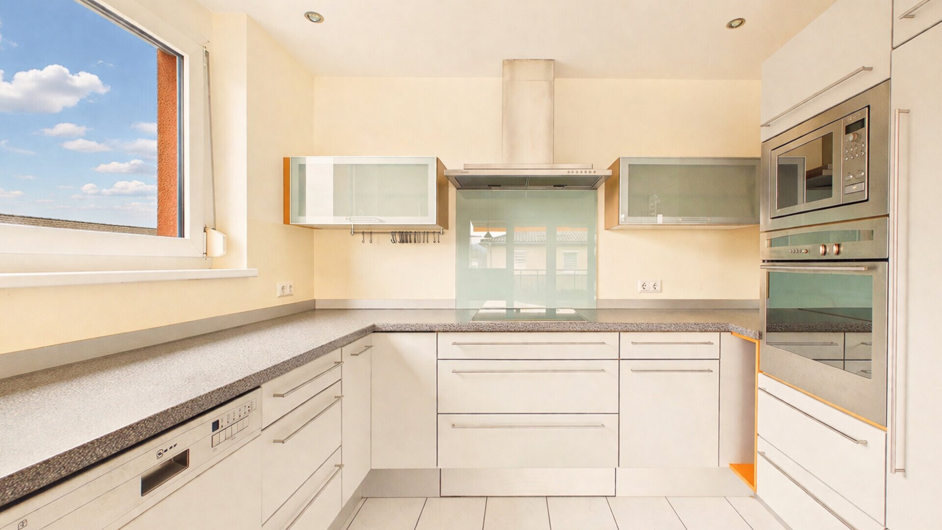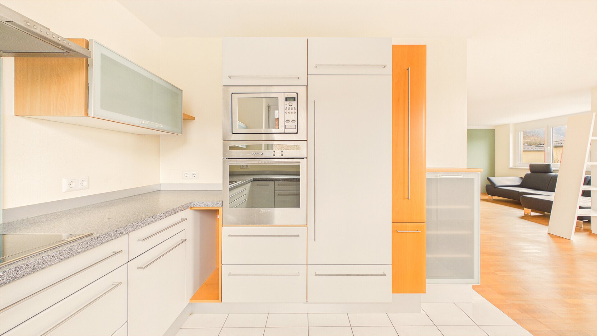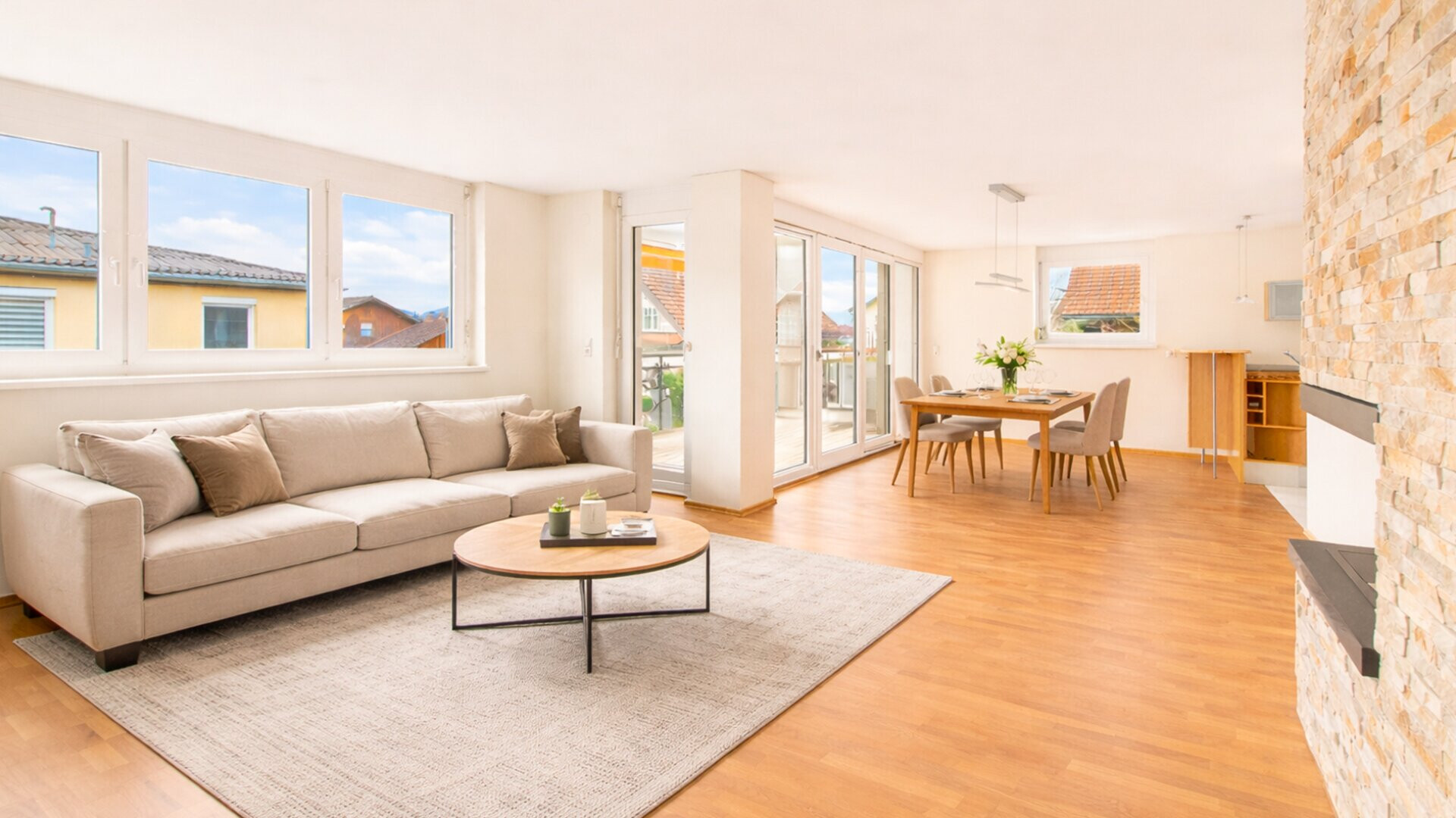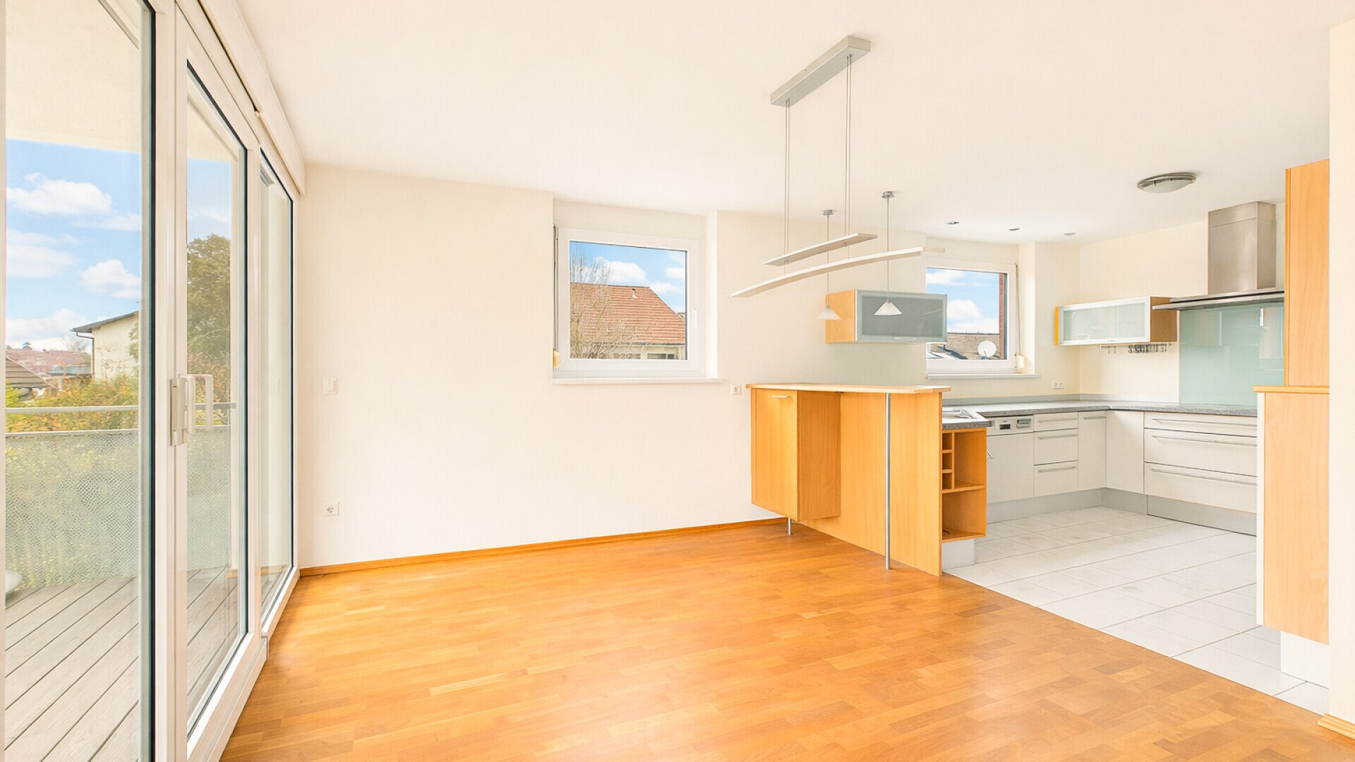 Das Herzstück bildet der großzügige Wohn-Essbereich mit viel Platz für den Alltag und gesellige Stunden. Die Küche ist funktional ausgestattet und verfügt über hochwertige Geräte von NEFF sowie einem Kühlschrank mit Tiefkühlfach von Liebherr. Im Wohnbereich sorgt ein Ethanolofen für eine besondere Atmosphäre. Eine vorgesetzte Wand schafft eine saubere Lösung für Kabel und Medientechnik. Vom Wohn-Essbereich gelangt man direkt auf die großzügige, südwestlich ausgerichtete Loggia mit Markise und elektrischem Rollo, die viel Platz bietet und zu gemütlichen Stunden im Freien einlädt.