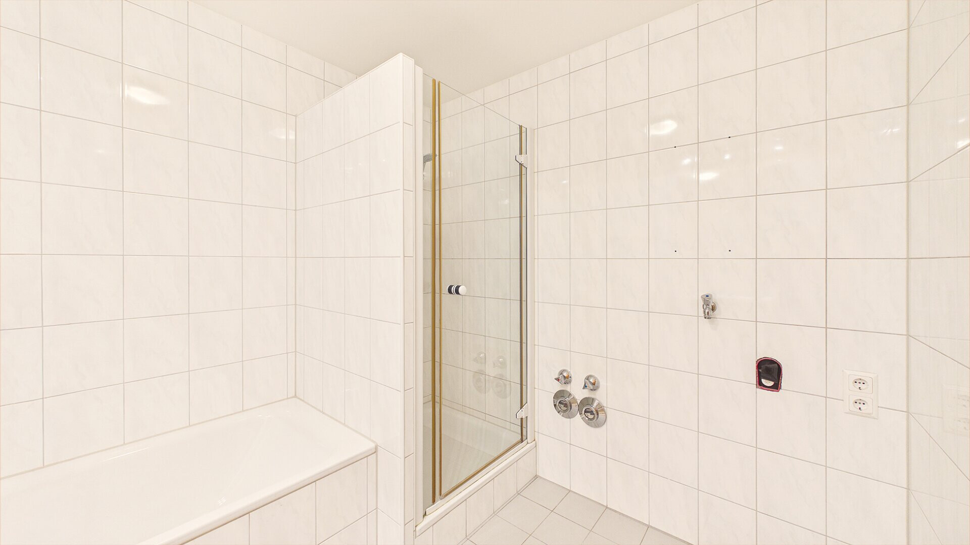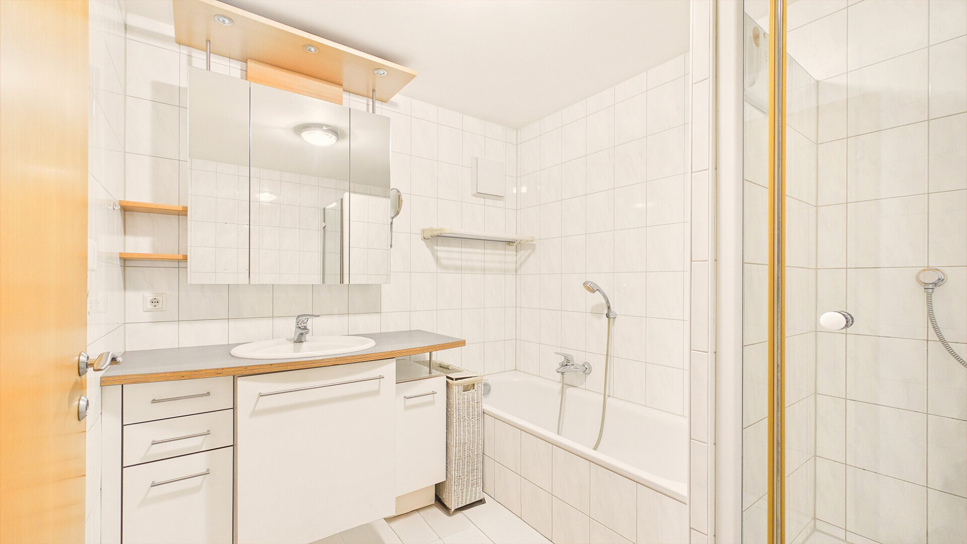 Das Badezimmer ist mit Dusche, Badewanne und Waschmaschinenanschluss ausgestattet. Das WC ist separat angeordnet. Ergänzt wird das Raumangebot durch einen praktischen Abstellraum mit Stromanschluss, der zusätzlichen Stauraum bietet.