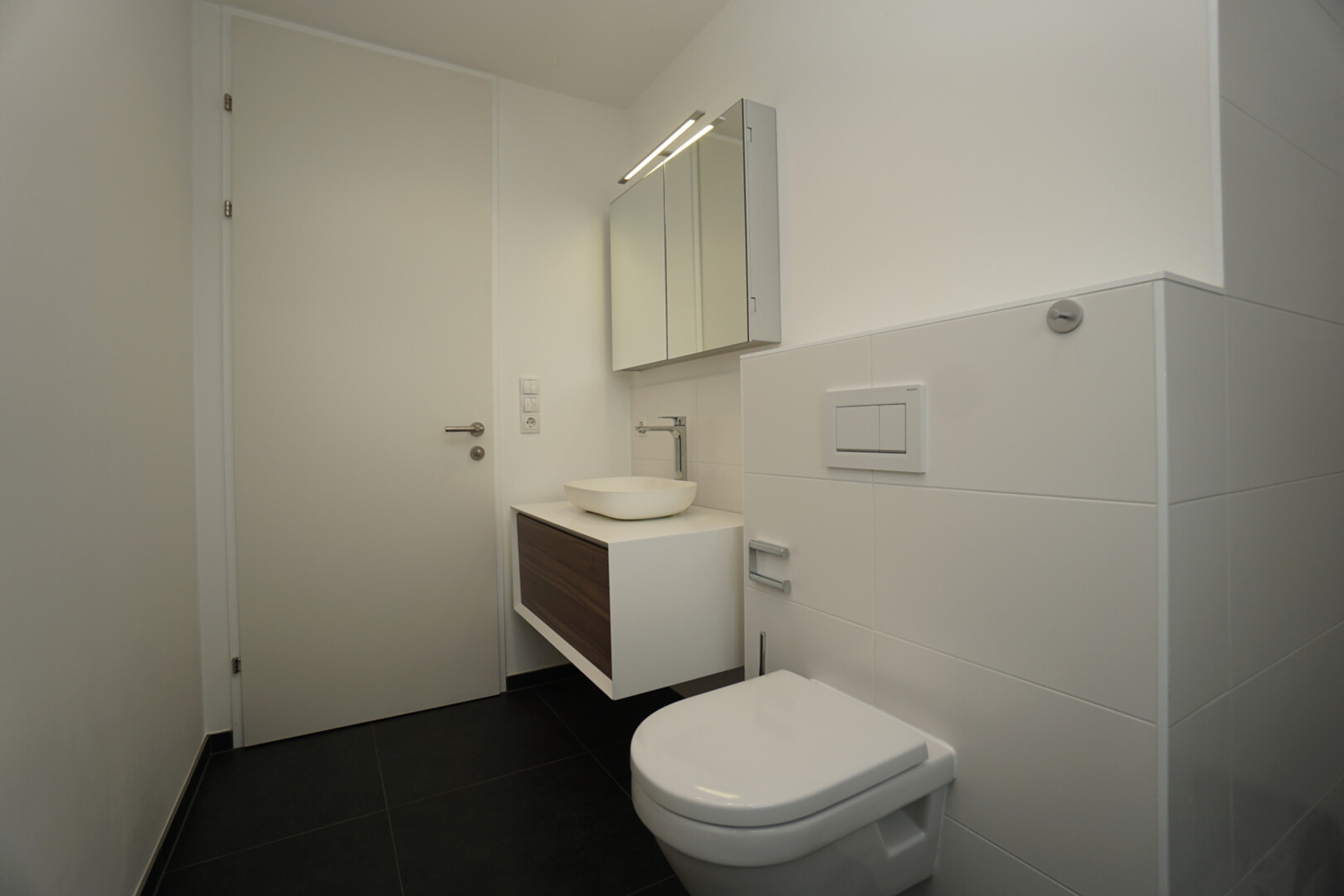 Das Badezimmer ist mit einer begehbarer Dusche samt WC und einem modernen Waschbeckenverbau ausgestattet.