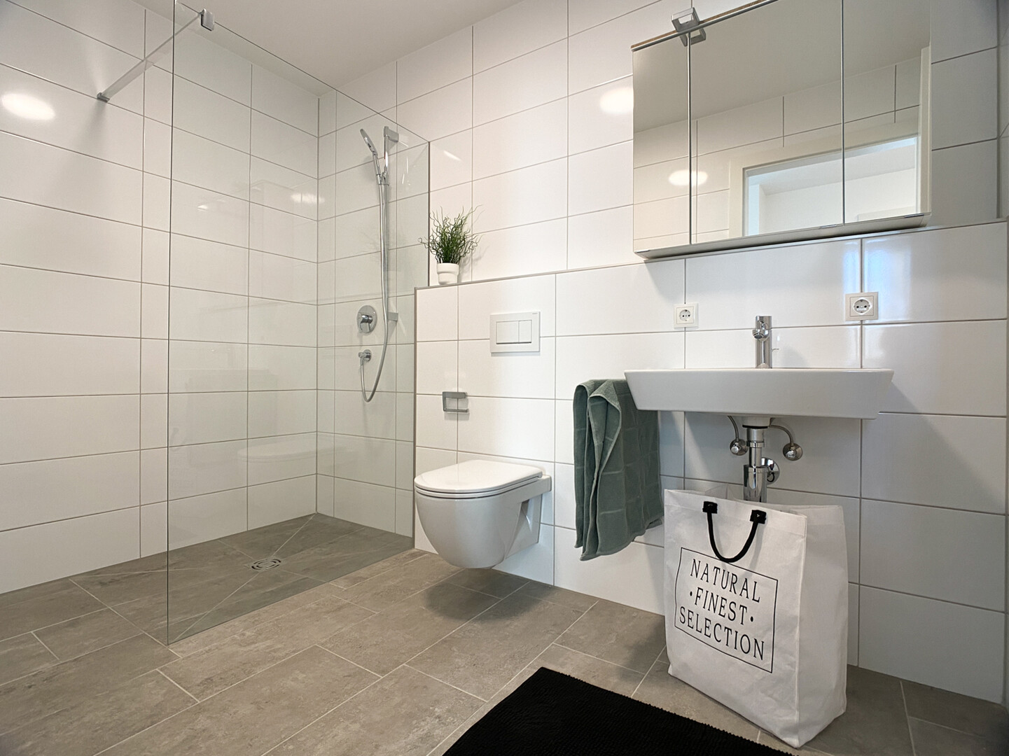 Das stilvolle Badezimmer überzeugt durch hochwertige Sanitärausstattung und modernes Design. Eine bodengleiche Dusche, edle Armaturen und geschmackvolle Fliesen schaffen eine Wohlfühloase, die keine Wünsche offenlässt.