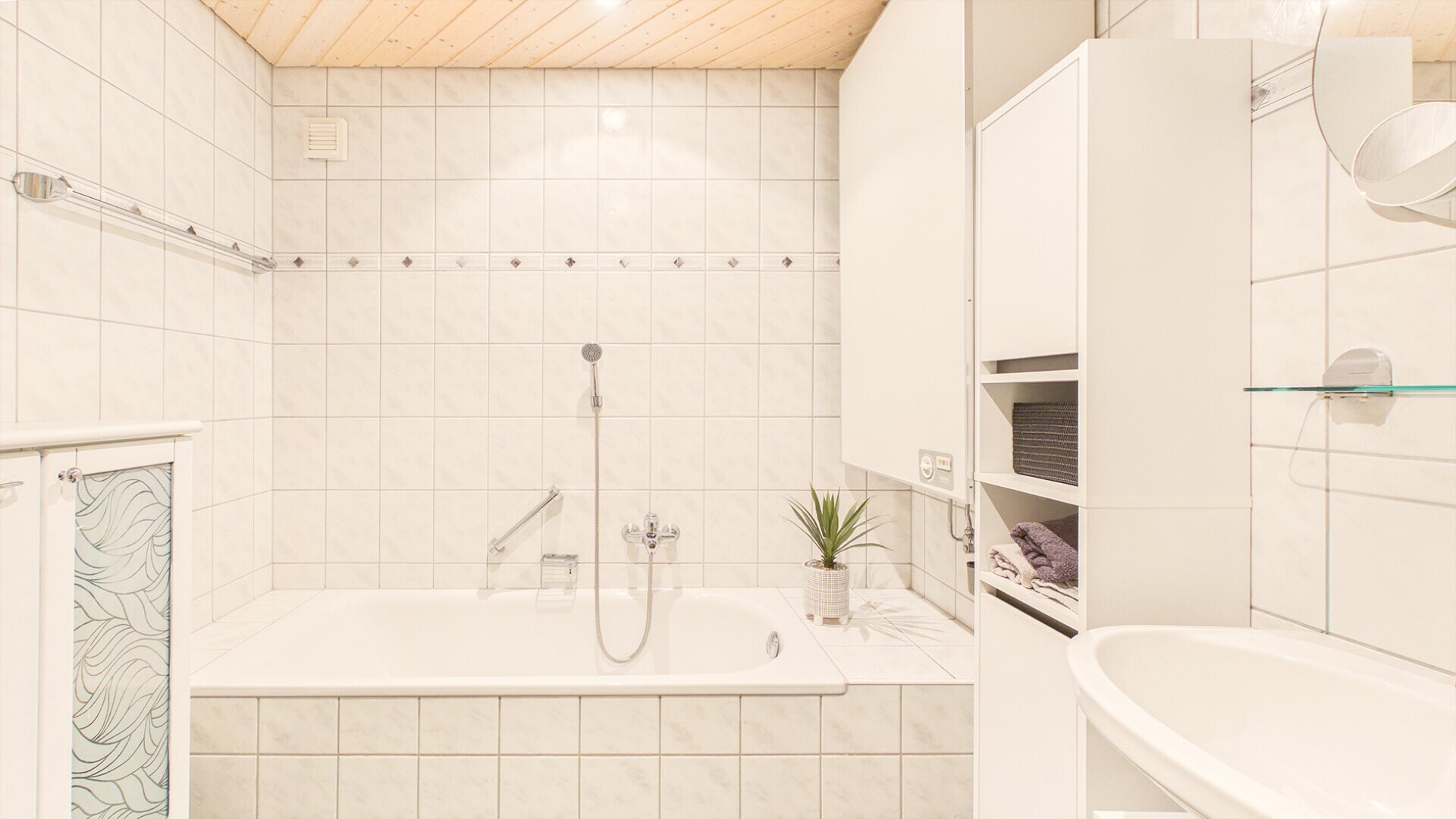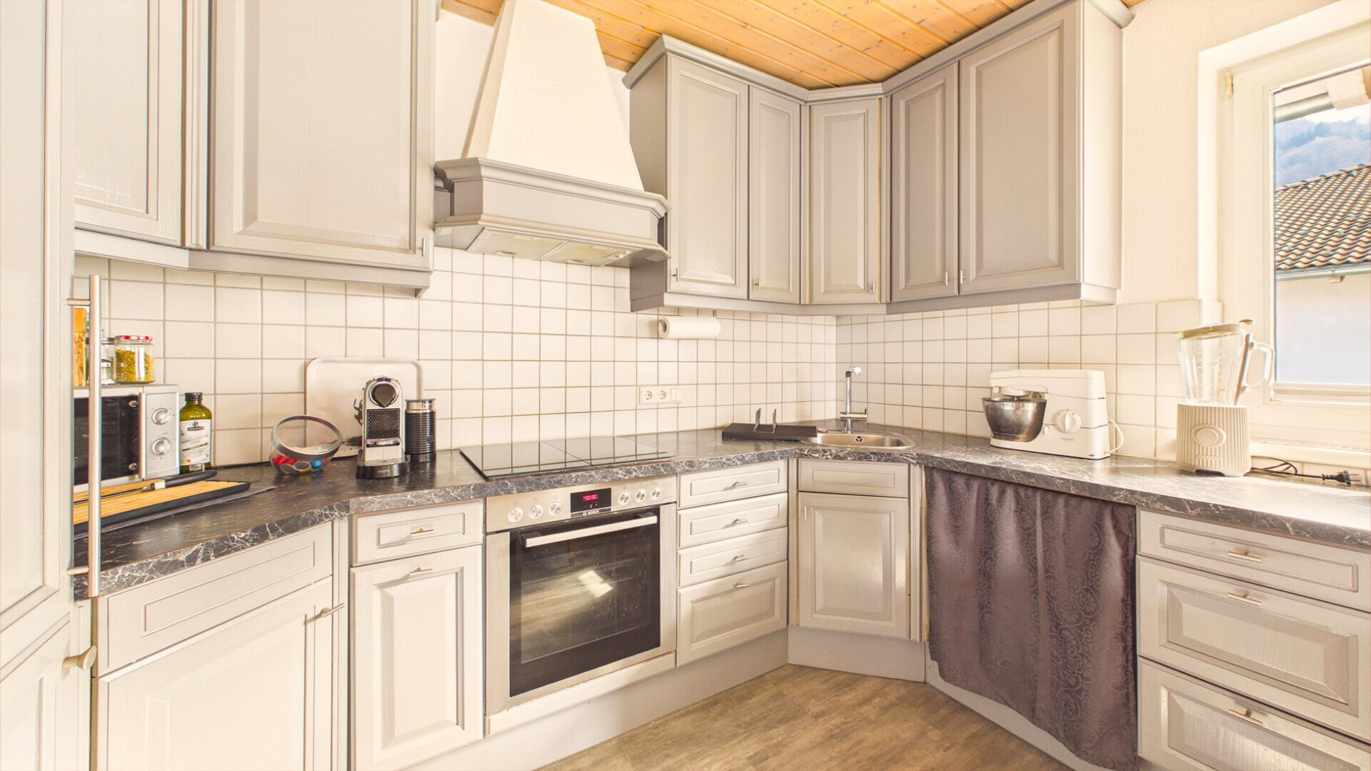 Die Küche ist mit einem Bosch-Backrohr, einem Herd, Kühlschrank + Tiefkühlfach und genügend Stauraum ausgestattet. Die Arbeitsplatten wurden vor rund fünf Jahren vom Tischler erneuert. Die südlich ausgerichtete Loggia verfügt über eine Markise und bietet einen angenehmen Platz im Freien.
