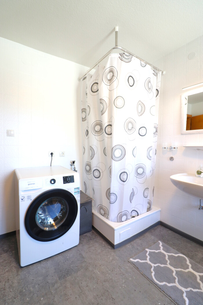 - Badezimmer mit Fenster, Badewanne, Dusche, WC und Waschmaschinenanschluss