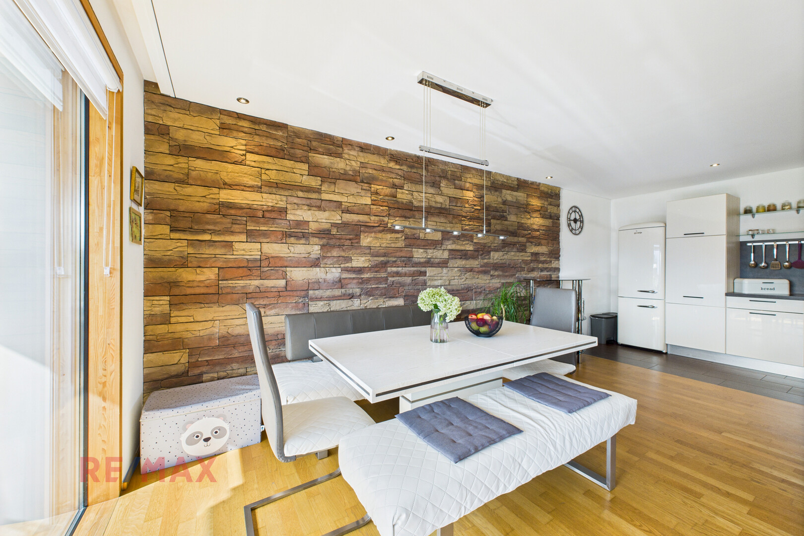 Die lichtdurchfluteten Räume schaffen ein offenes und einladendes Wohngefühl. Besonders hervorzuheben ist der stilvolle Wohn-/Essbereich mit indirekter Beleuchtung, die gemeinsam mit dem hochwertigen Steinwand-Element ein edles, stimmungsvolles Ambiente erzeugt. Auch im Gang sorgt das stimmige Lichtkonzept für ein warmes, harmonisches Raumgefühl.
