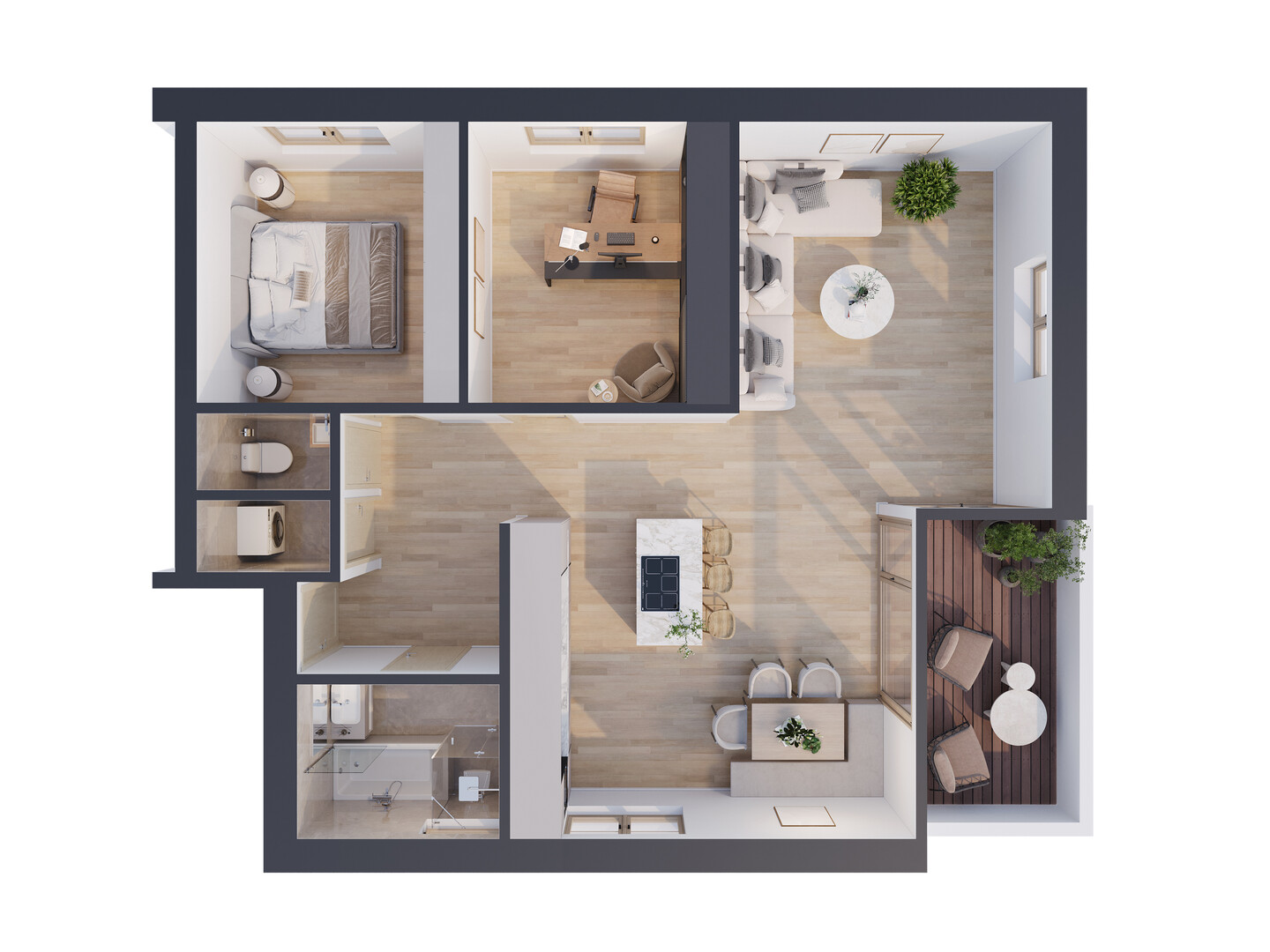 Besonderer Wert wird auf hochwertige, nachhaltige und komfortable Ausstattung gelegt. Dreifach verglaste Holz-Alu-Fenster mit elektrischen Rollläden, eine Sicherheitseingangstür sowie raumhohe Innentüren unterstreichen den gehobenen Anspruch. Eine Fußbodenheizung mit Kühlfunktion, Smarthome-Vorbereitung und barrierefreie Ausführung bieten zeitgemäßen Wohnkomfort. Edles Eichenparkett und elegante Fliesen verleihen den Räumen eine zeitlose Wohnlichkeit. Die Badezimmer überzeugen mit bodengleicher Dusche, Badewanne und hochwertigen Markenarmaturen. Elektrische Beschattungen und Markisen sorgen für angenehmes Raumklima. Überdachte Balkone, großzügige Außenflächen sowie im Erdgeschoss Eigengärten mit Möglichkeit für Hochbeete schaffen zusätzlichen Lebensraum im Freien.