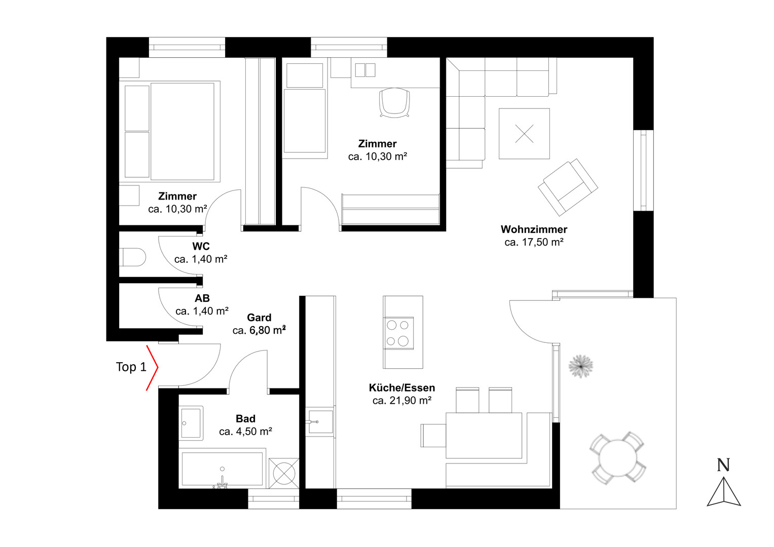 Top 01 ist eine hochwertig ausgestattete 3,5-Zimmer-Wohnung, die modernen Komfort mit einem harmonischen Wohnambiente verbindet. Der offen gestaltete Bereich für Essen und Kochen mit ca. 21,9 m² bildet das Herzstück der Wohnung und überzeugt durch seine einladende Atmosphäre. Ergänzt wird das Raumangebot durch zwei Schlafzimmer mit jeweils ca. 10,3 m², ein Wohnzimmer mit ca. 17,5 m², ein Badezimmer mit ca. 4,5 m², ein separates WC mit ca. 1,4 m², einen praktischen Abstellraum mit ca. 1,4 m² sowie eine großzügige Garderobe mit ca. 6,8 m². Der ca. 9,5 m² große Balkon erweitert den Wohnraum ins Freie und lädt zum Entspannen mit Blick ins Grüne ein. Ein eigenes Kellerabteil mit ca. 6,2 m² sorgt für zusätzlichen Stauraum.
