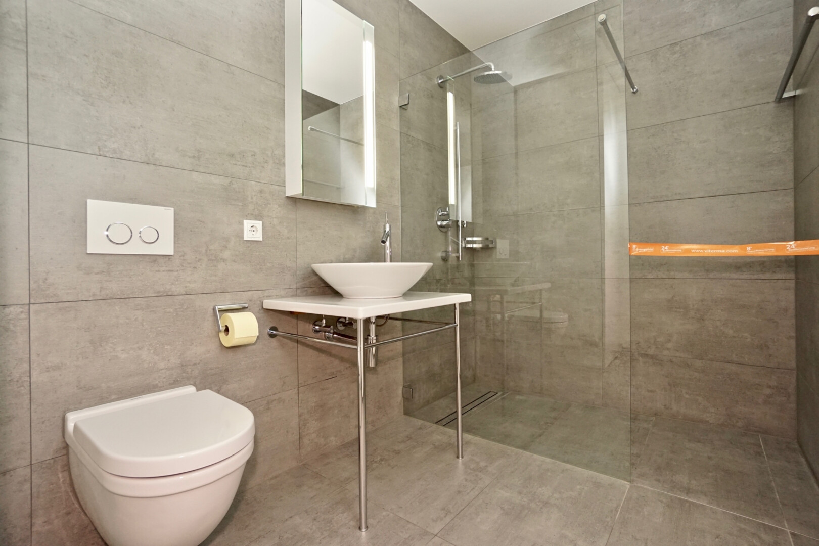 Der durchgehend verlegte, pflegeleichte Feinsteinzeugboden in elegantem Dekor verleiht der Wohnung ein modernes und harmonisches Gesamtbild – sogar im Bad und auf dem Balkon. Hier lässt sich der Feierabend bei einem Glas Wein entspannt genießen.