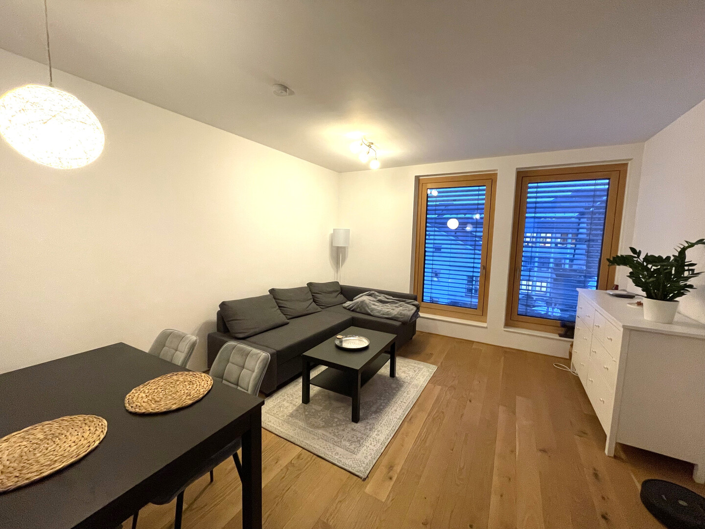 Der offen gestaltete Wohn- und Essbereich ist mit einer Einbauküche ausgestattet, die über einen Kühlschrank, einen Geschirrspüler sowie einen Herd mit Backofen und Dunstabzug verfügt. Das helle und großzügige Schlafzimmer ist – ebenso wie die übrigen Wohnräume – mit einem hochwertigen Parkettboden versehen.