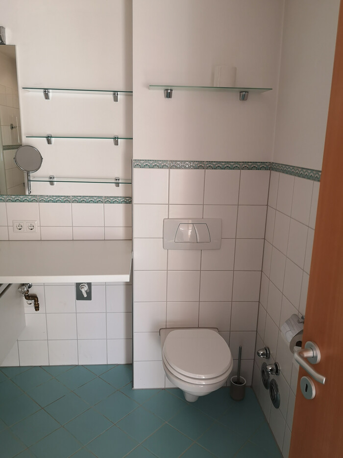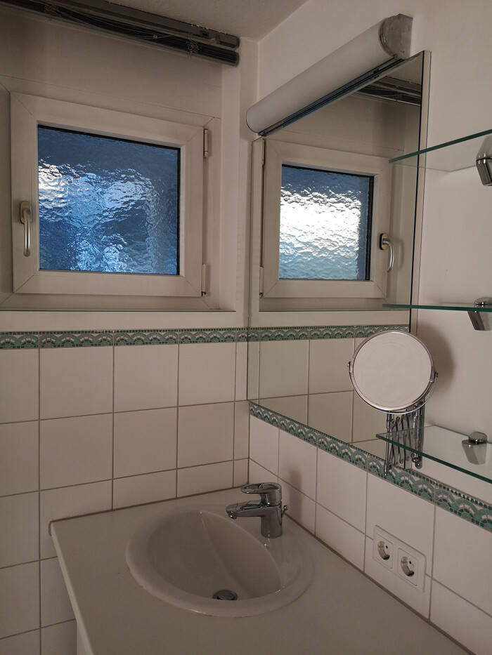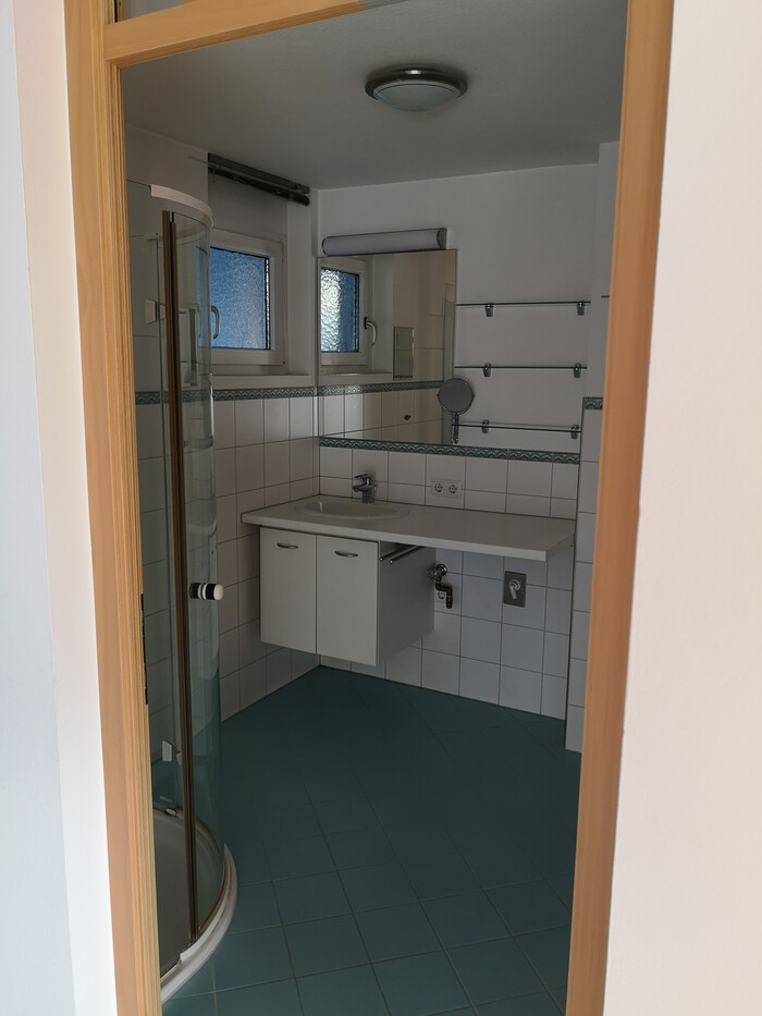 Bad mit Fenster: Dusche, Waschtisch, WC, Waschmaschinenanschluss