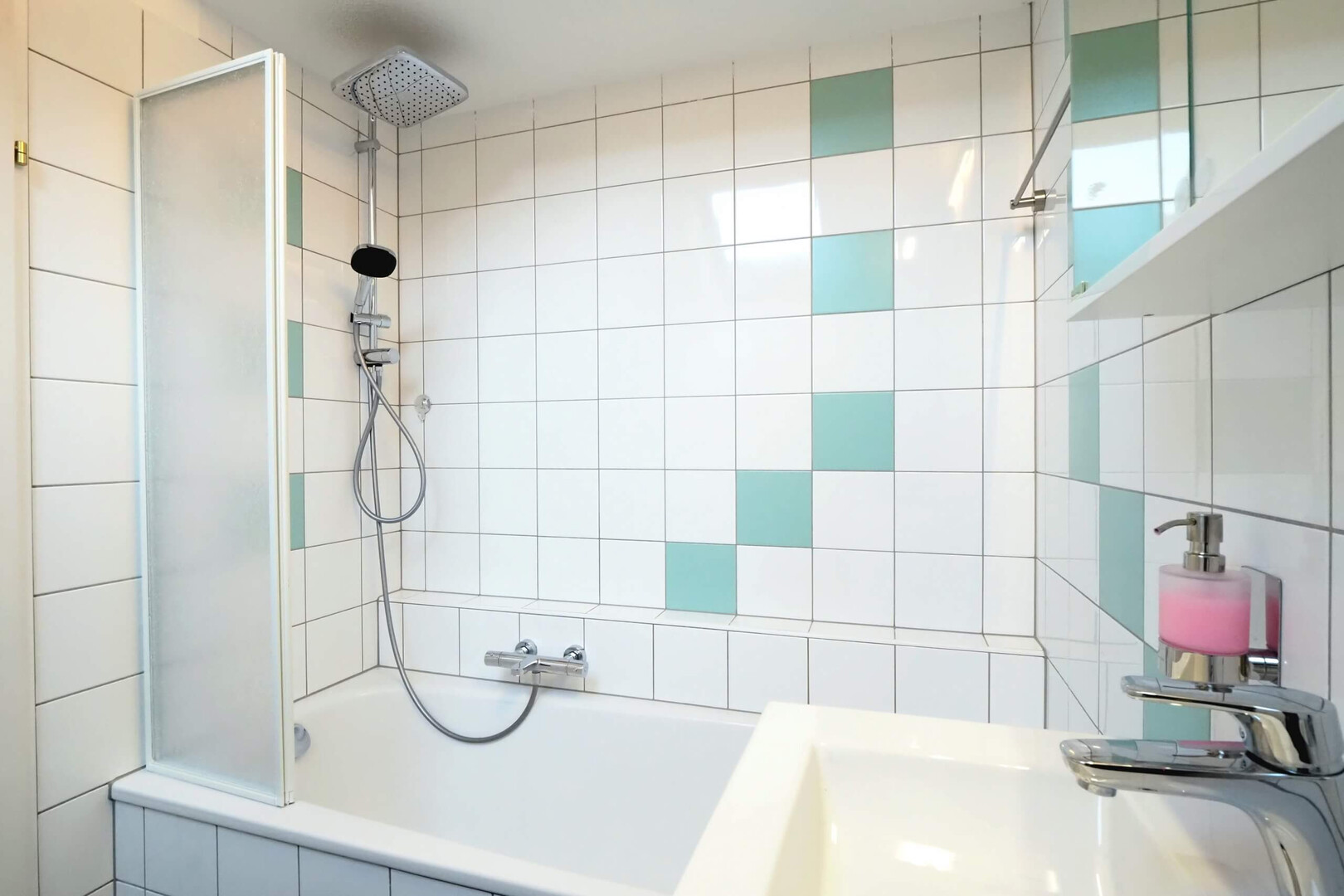 Das Tageslichtbad überzeugt mit Fenster, Badewanne, Waschbecken sowie WC und präsentiert sich in einem zeitlosen, modernen Design.