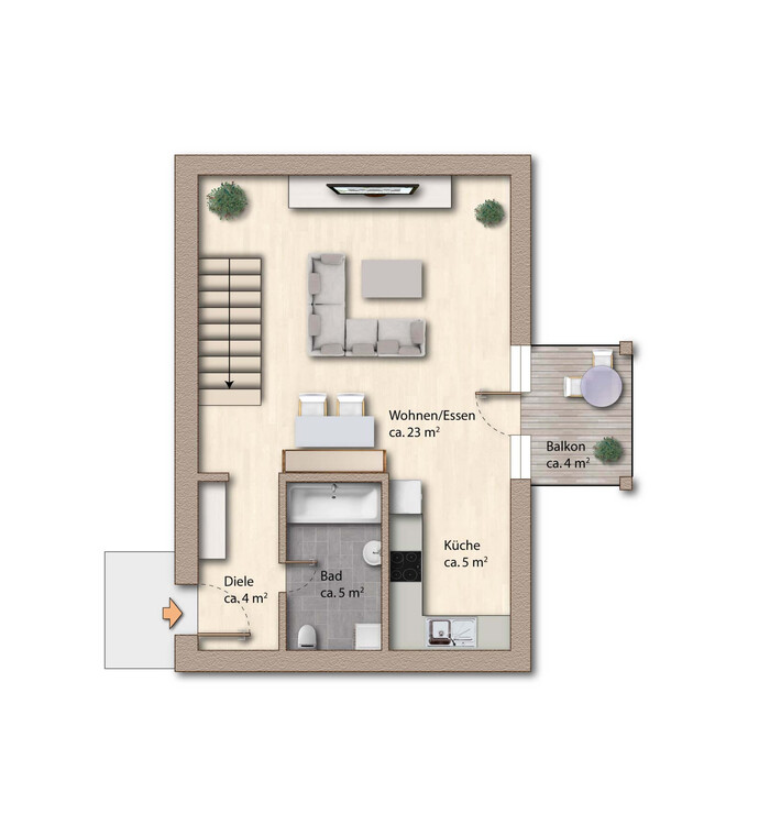 Besonders erholsame Momente genießen Sie auf dem Balkon, der direkt vom Wohnbereich aus zugänglich ist.