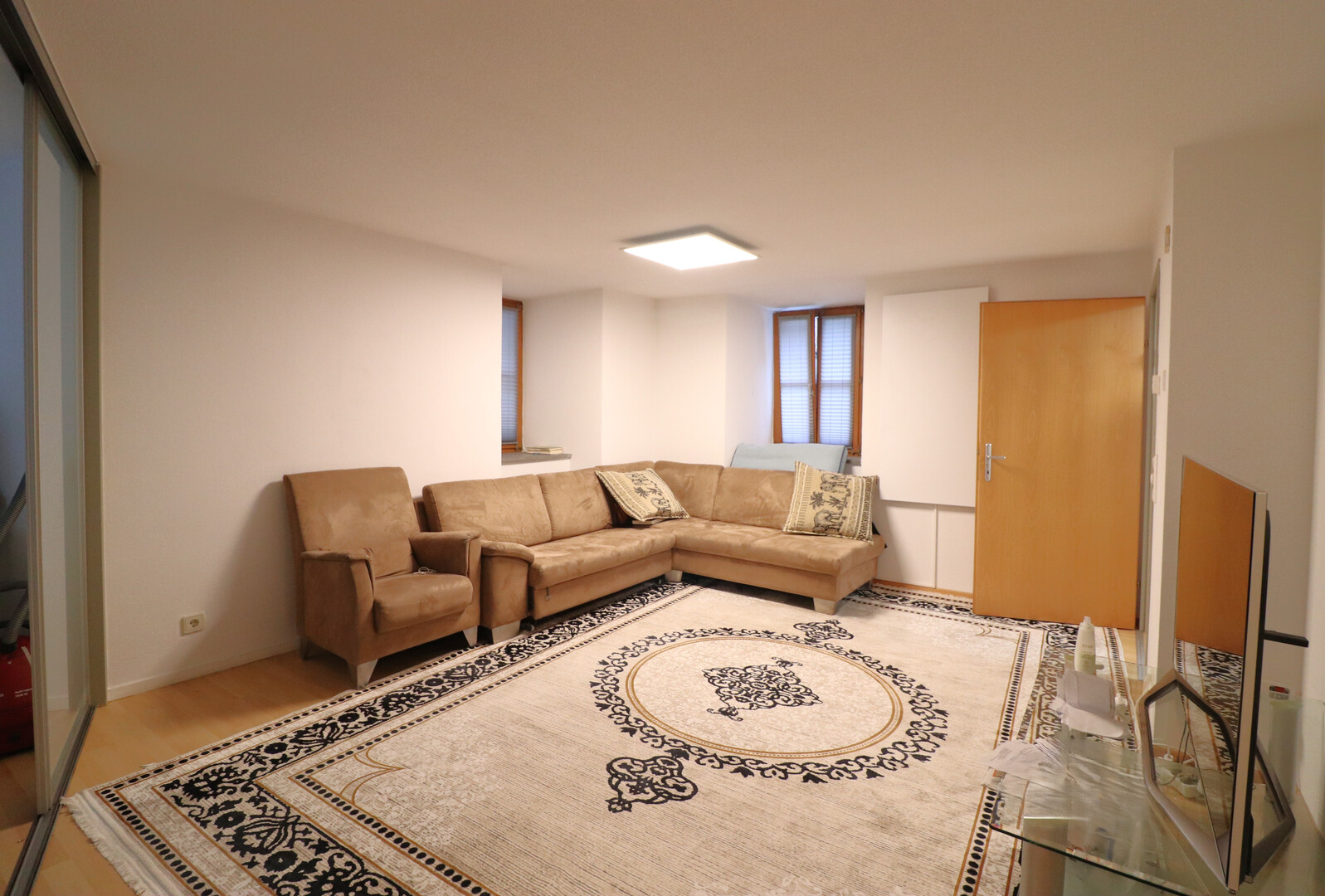 großzügiger Wohnraum mit Zugang ins Schlafzimmer und zur Küche