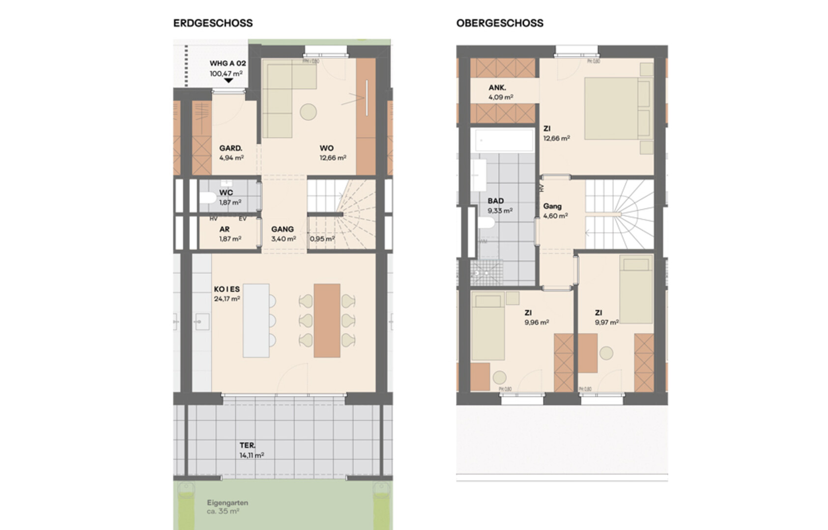 Das Erdgeschoss vereint Wohnen, Essen und Kochen zu einem gemütlichen Bereich, während im Obergeschoss die Schlafzimmer situiert sind. Auf jeder Etage befindet sich ein Abstellraum bzw. ein begehbarer Kleiderschrank – zusätzlichen Stauraum bietet das eigene Kellerabteil, damit in den Wohnräumen Platz für die wesentlichen Dinge bleibt. Ein Gäste-WC, das Bad im OG und die vom Wohnraum getrennte Garderobe vollenden den Wohntraum. Jedes Haus verfügt über eine überdachte Terrasse und einen privaten Garten. Hier sind entspannte Stunden in der eigenen kleinen Oase garantiert. Weiters werden überdachte PKW-Einstellplätze und Gästeparkplätze realisiert.