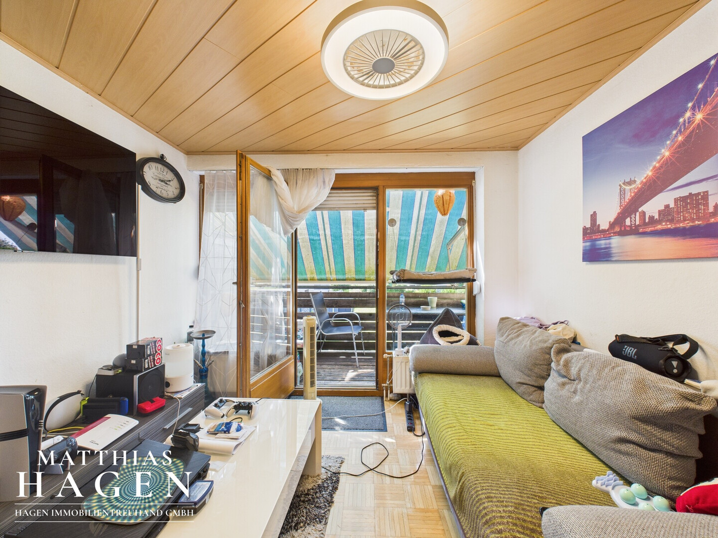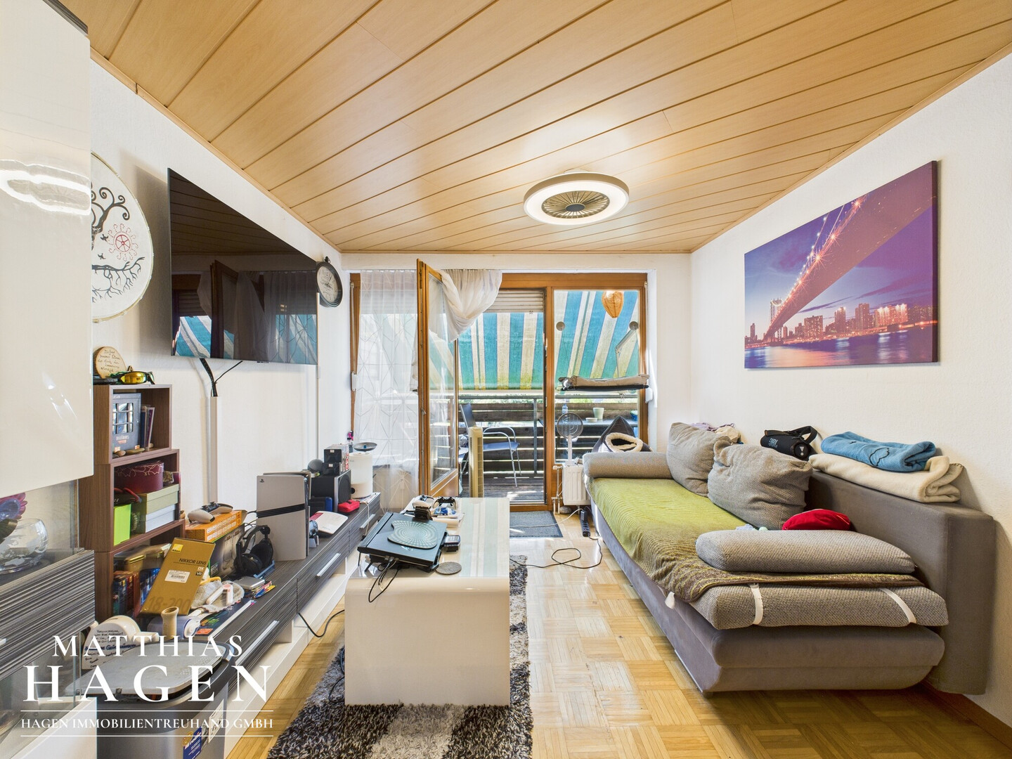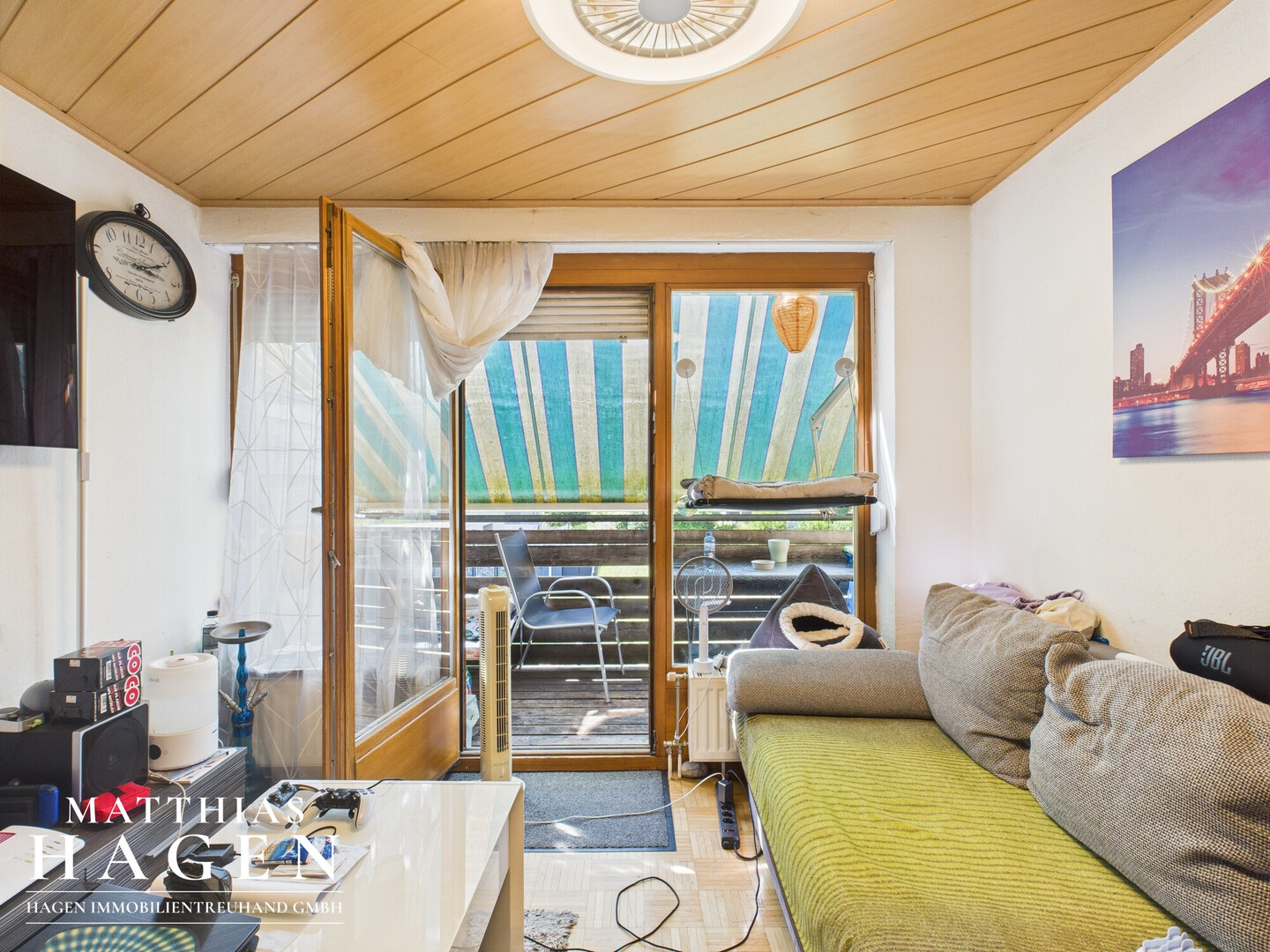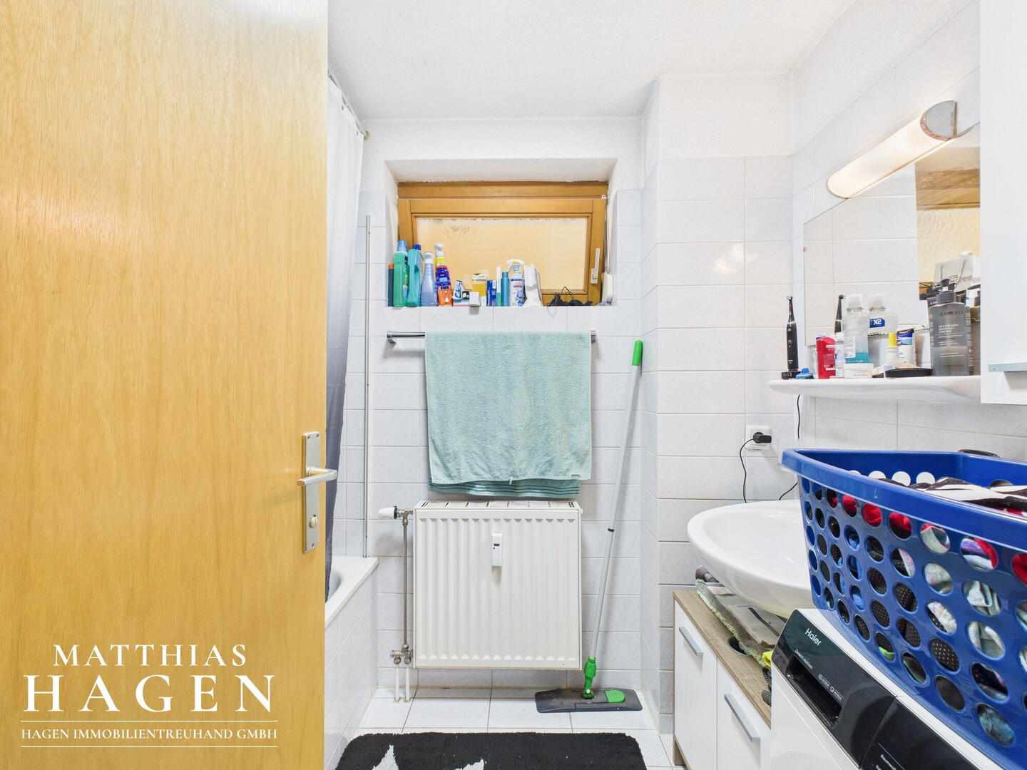 Die Wohnung verfügt über einen hellen Wohnbereich mit Zugang zum Balkon, der dank der vorhandenen Markise zusätzlichen Wohnkomfort bietet. Das Badezimmer ist mit Fenster und Badewanne ausgestattet.