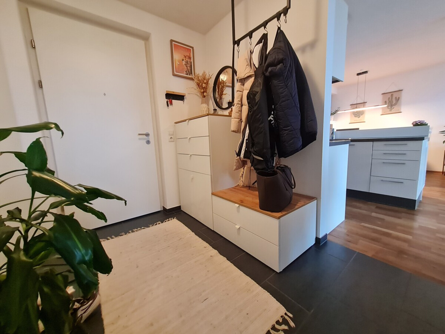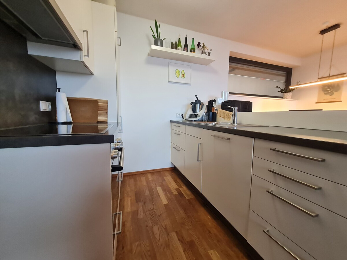 Der offen gestaltete Wohn-/Essbereich mit integrierter Einbauküche schafft ein großzügiges Raumgefühl und eignet sich ideal zum Wohnen und Empfangen. Hochwertige Bodenbeläge aus Parkett und Fliesen unterstreichen den gepflegten Gesamteindruck und sorgen für eine ansprechende Kombination aus Komfort und Funktionalität. Das großzügige Schlafzimmer bietet einen ruhigen Rückzugsort, das Badezimmer ist modern ausgeführt und verfügt sowohl über eine Dusche als auch über eine Badewanne – ideal für den Alltag wie auch für entspannte Wohlfühlmomente.