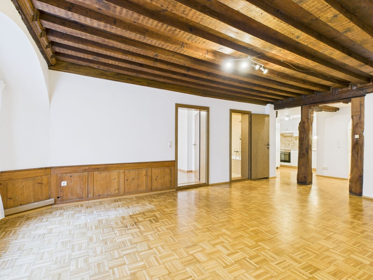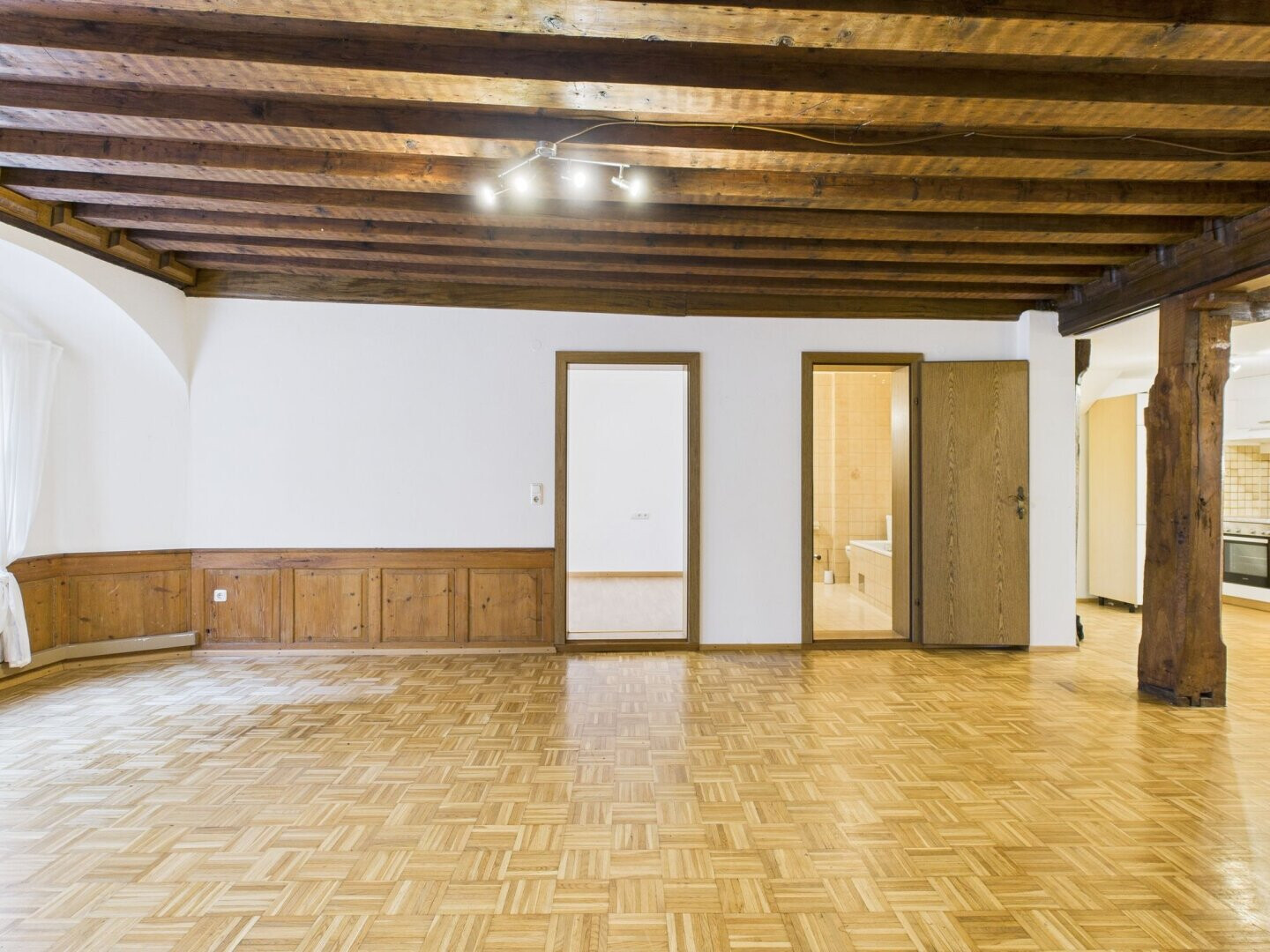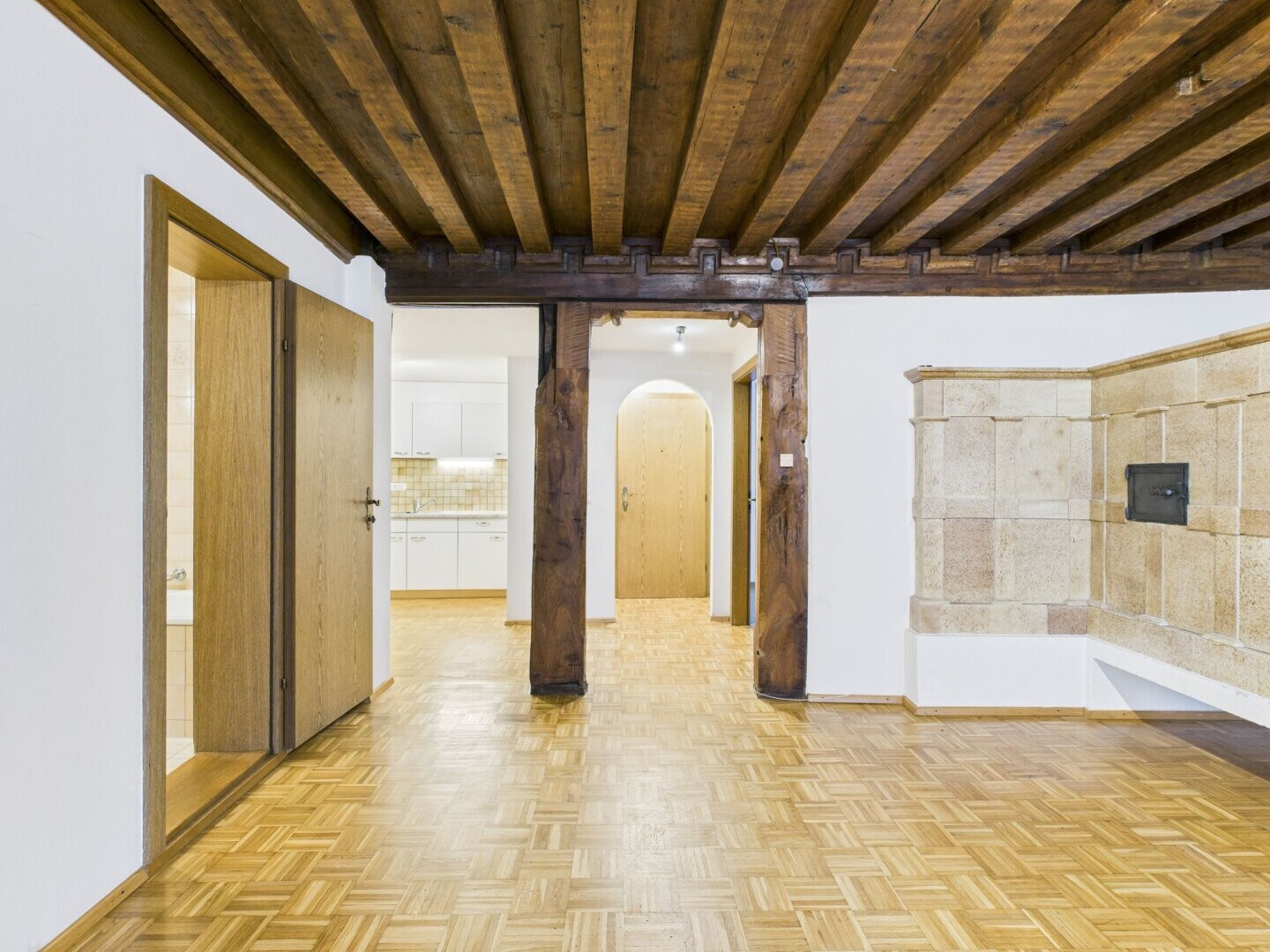 Im ersten Stock dieses Gebäudes befindet sich diese Charmante 3-Zimmer-Wohnung. Ein gut erhaltener Parkettboden befindet sich im gesamten Wohn-Essbereich. Unterstrichen wird der gesamte Stil durch die Sichtbaren Holzbalken im Eingangsbereich und der Decke im Wohnbereich. Auch der Holzofen der nicht mehr in Betrieb ist, bildet ein typisch charakteristischer Hingucker. Die beiden Schlafzimmer sind mit Laminatböden ausgestattet. Die kleine Küche und das Badezimmer runden diese Altbauwohnung ab.