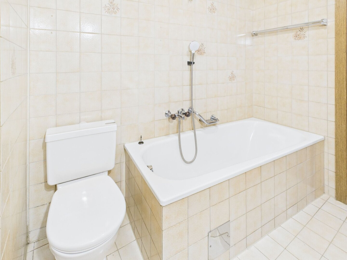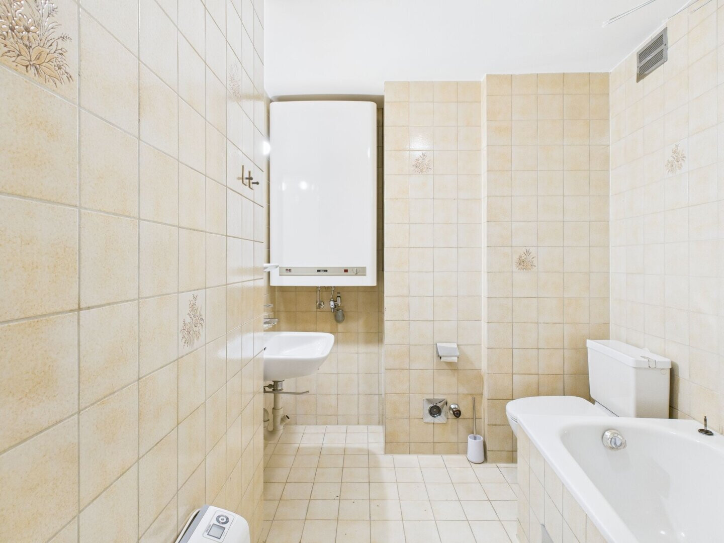 - Badezimmer mit WC und Badewanne sowie Anschlussmöglichkeit für Waschmaschine