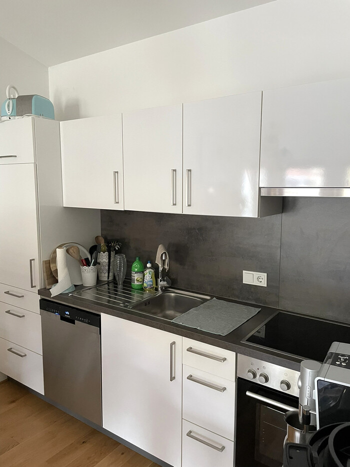 Im Eingangsbereich der Wohnung ist ausreichend Platz für eine Garderobe. Im hellen Wohn-/Essbereich befindet sich eine Einbauküche mit Kühlschrank, Geschirrspüler sowie einem Herd mit Backofen und Dunstabzug.