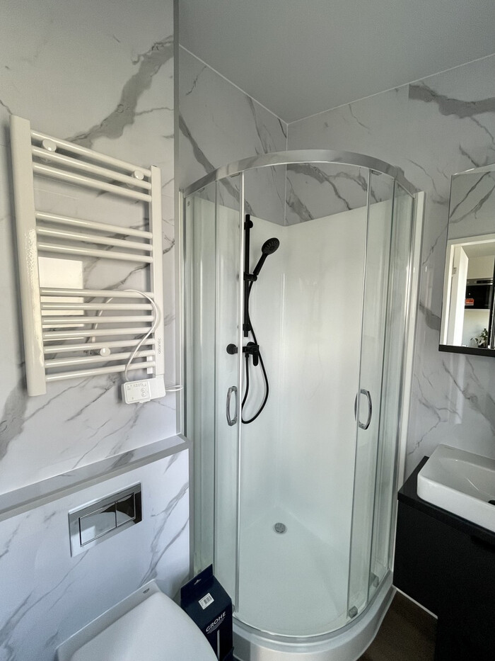 Badezimmer: Modernes Badezimmer mit Dusche und WC sowie einem Fenster, das für zusätzliche Belüftung sorgt.
