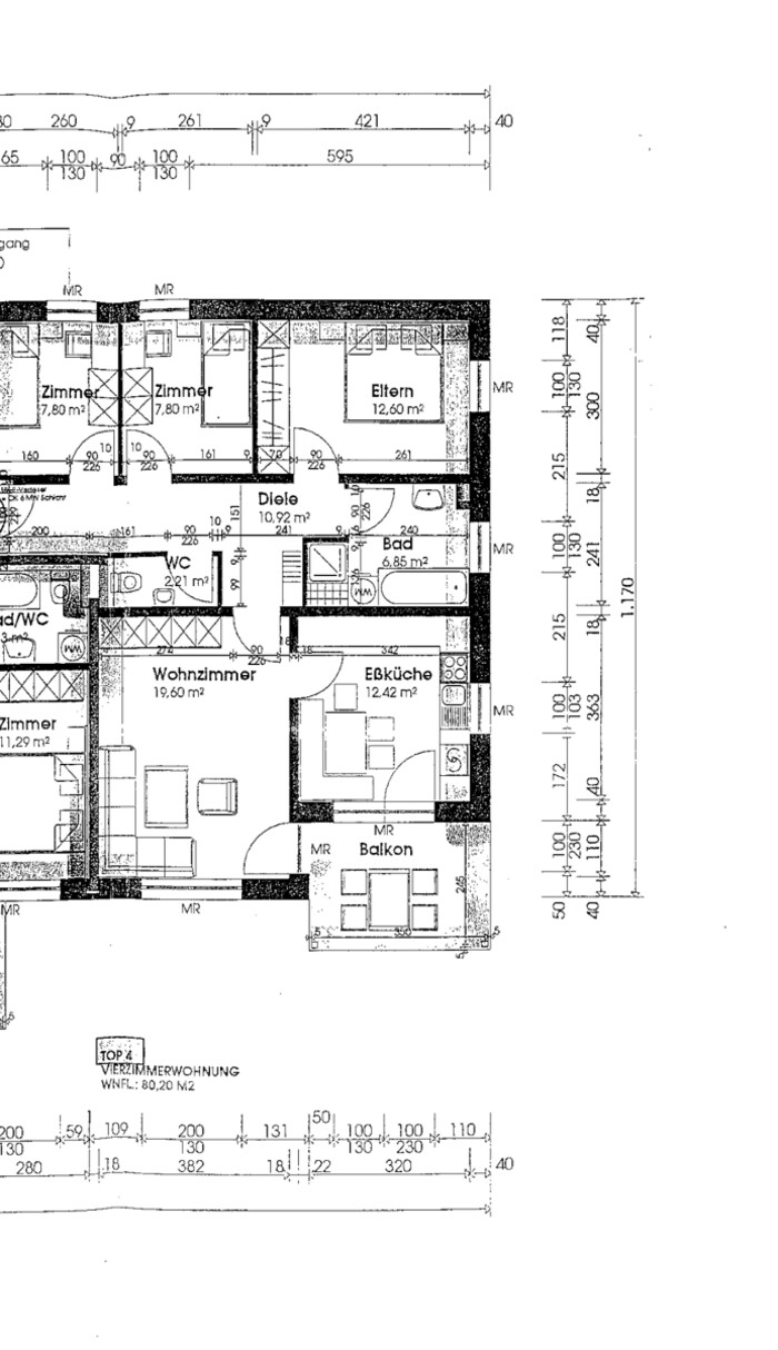 Die Wohnnutzfläche von ca. 79,99 m² verteilt sich auf ein großzügiges Wohnzimmer mit Zugang zum ca. 9 m² großen Balkon, eine moderne Küche, drei weitere Zimmer, ein Badezimmer und ein separates WC. Die Wohnung ist nur ohne Lift erreichbar, was im 1. Stock jedoch kaum ins Gewicht fällt.