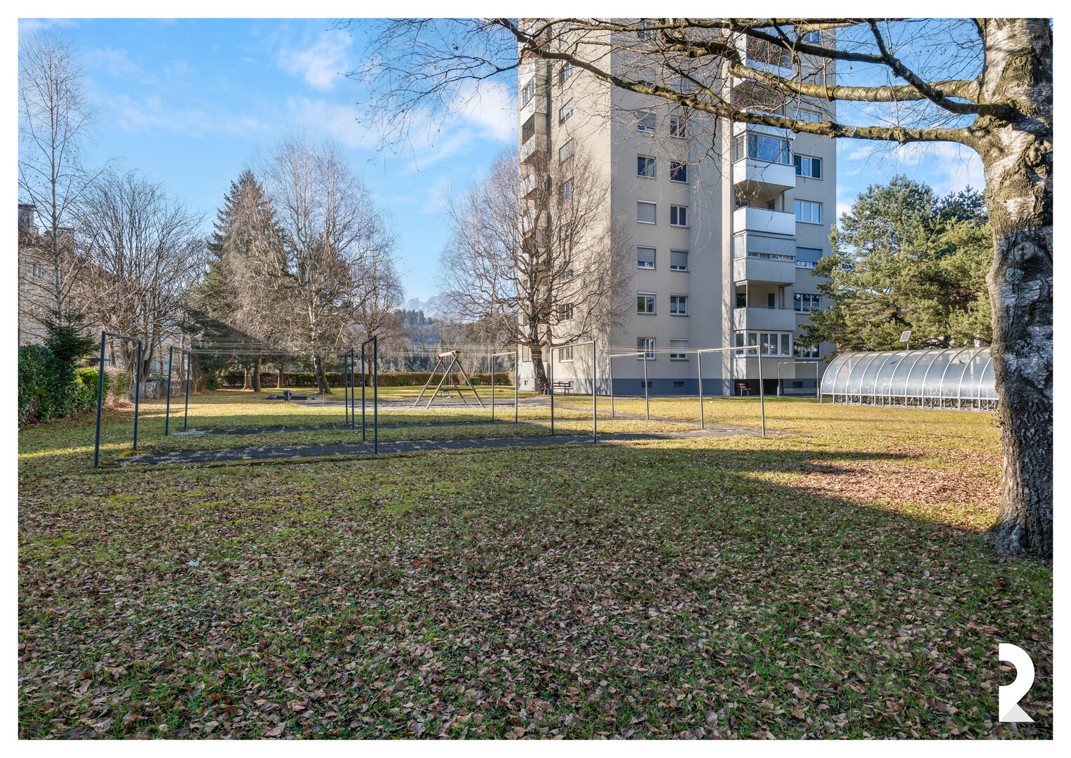 Zur Wohnung gehören ein Kellerabteil sowie ein Garagenplatz (G22). Allgemein stehen ein Fahrradraum, mehrere Trockenräume sowie ein großer Allgemeingarten mit Spielplatz zur Verfügung.