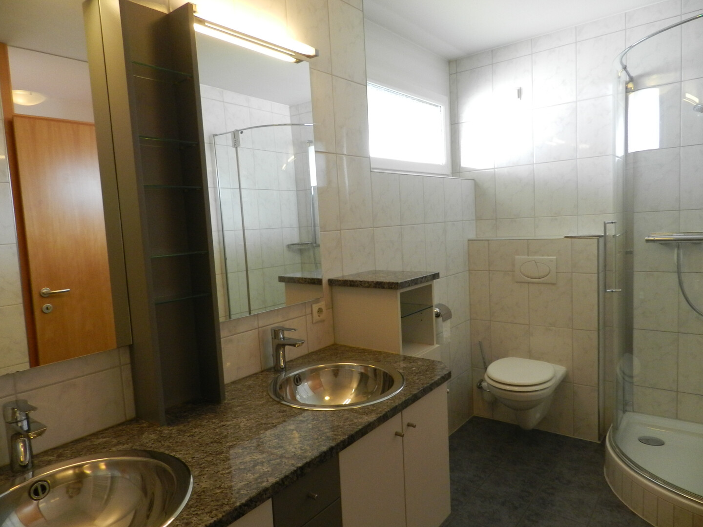 Badezimmer mit zwei Waschtischen und Unterbauschränken, Dusche, WC und Waschmaschinenanschluss