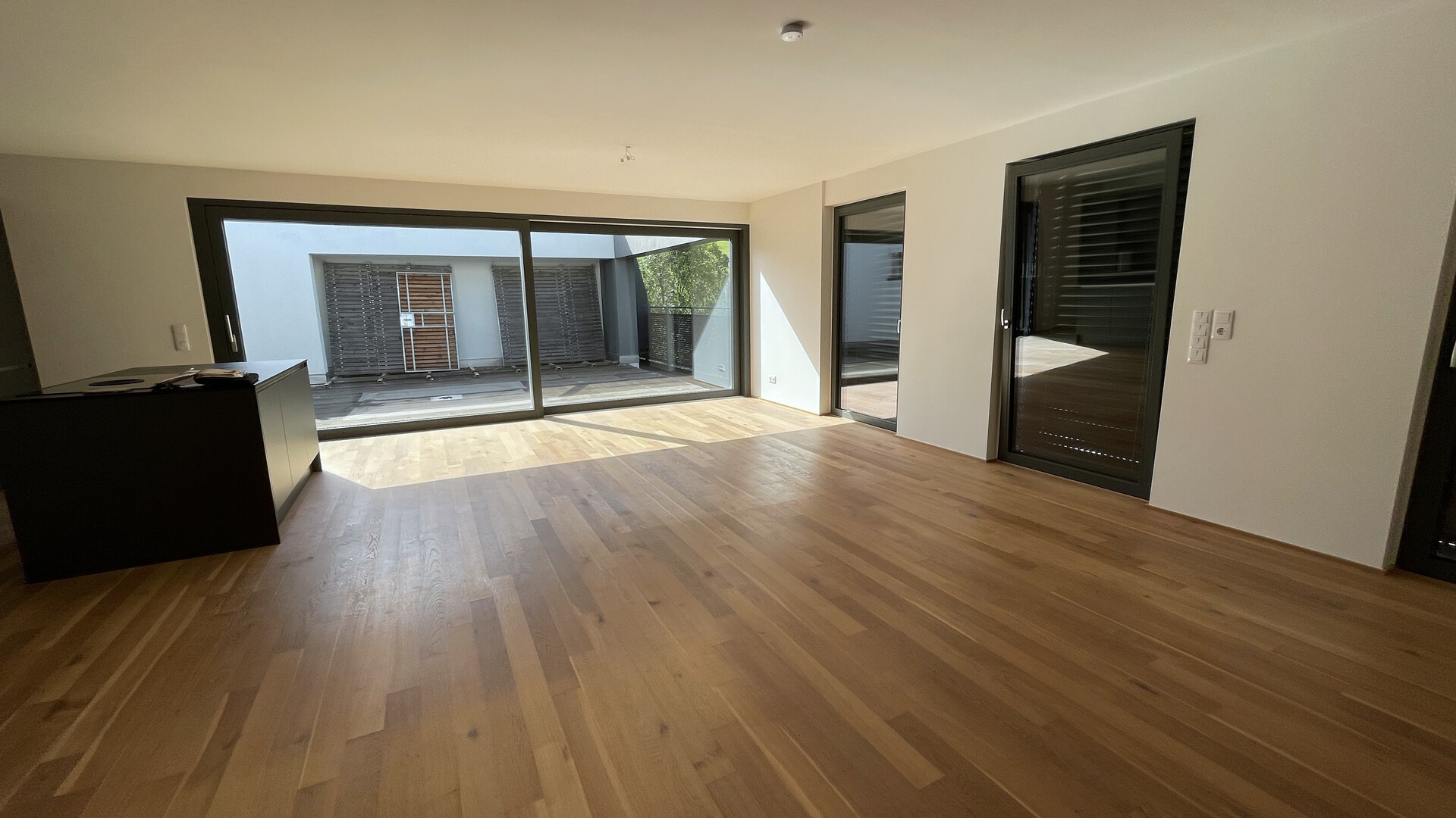 Ein besonderes Highlight der Wohnung ist die 77 m² große, umlaufende Terrasse mit Süd-West-Ausrichtung, die zum Entspannen und Verweilen einlädt. Ein zusätzlicher Außenabstellraum mit rund 7 m² bietet praktischen Stauraum. Die bisher vorhandenen Holzdielen wurden durch hochwertige Steinplatten ersetzt.