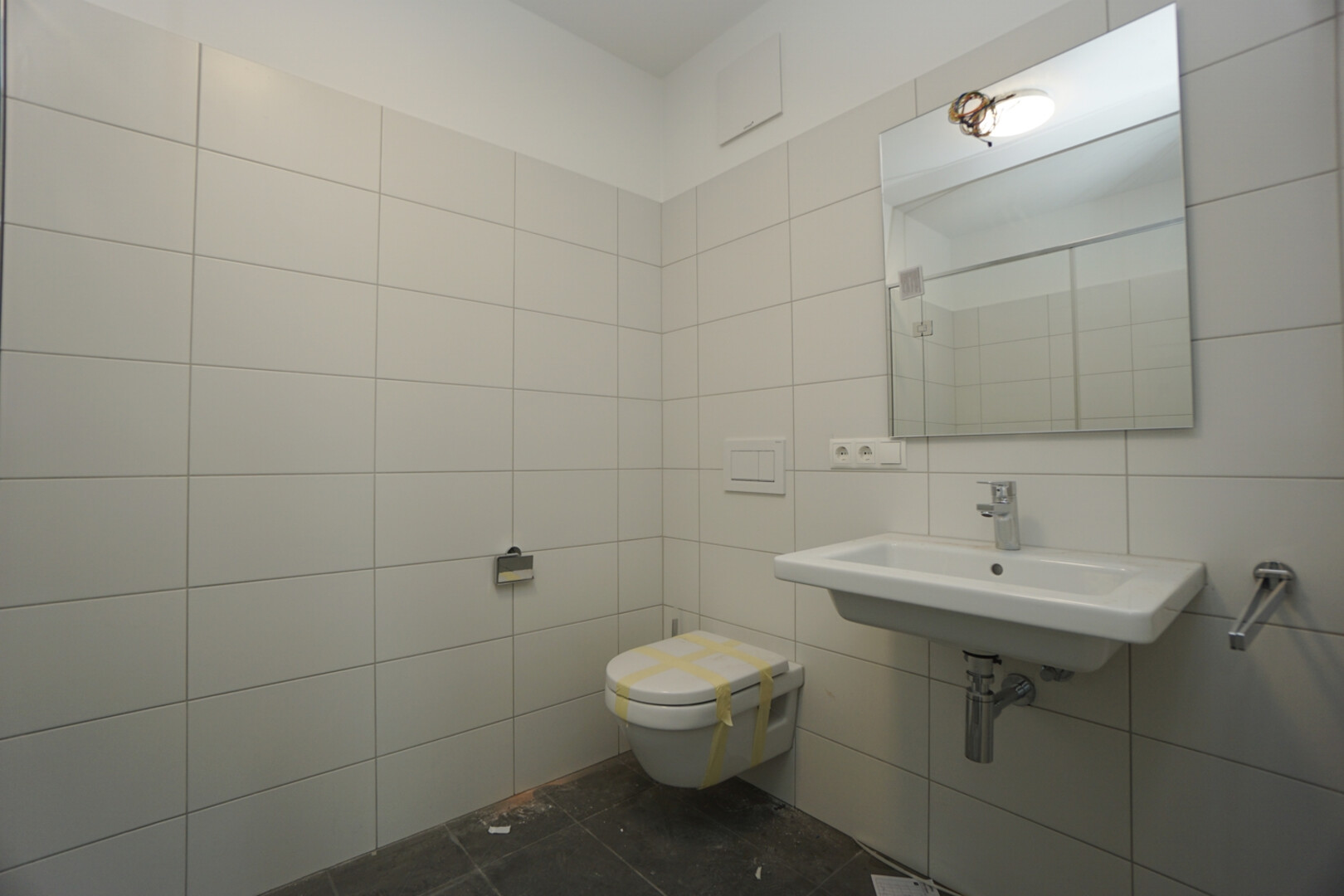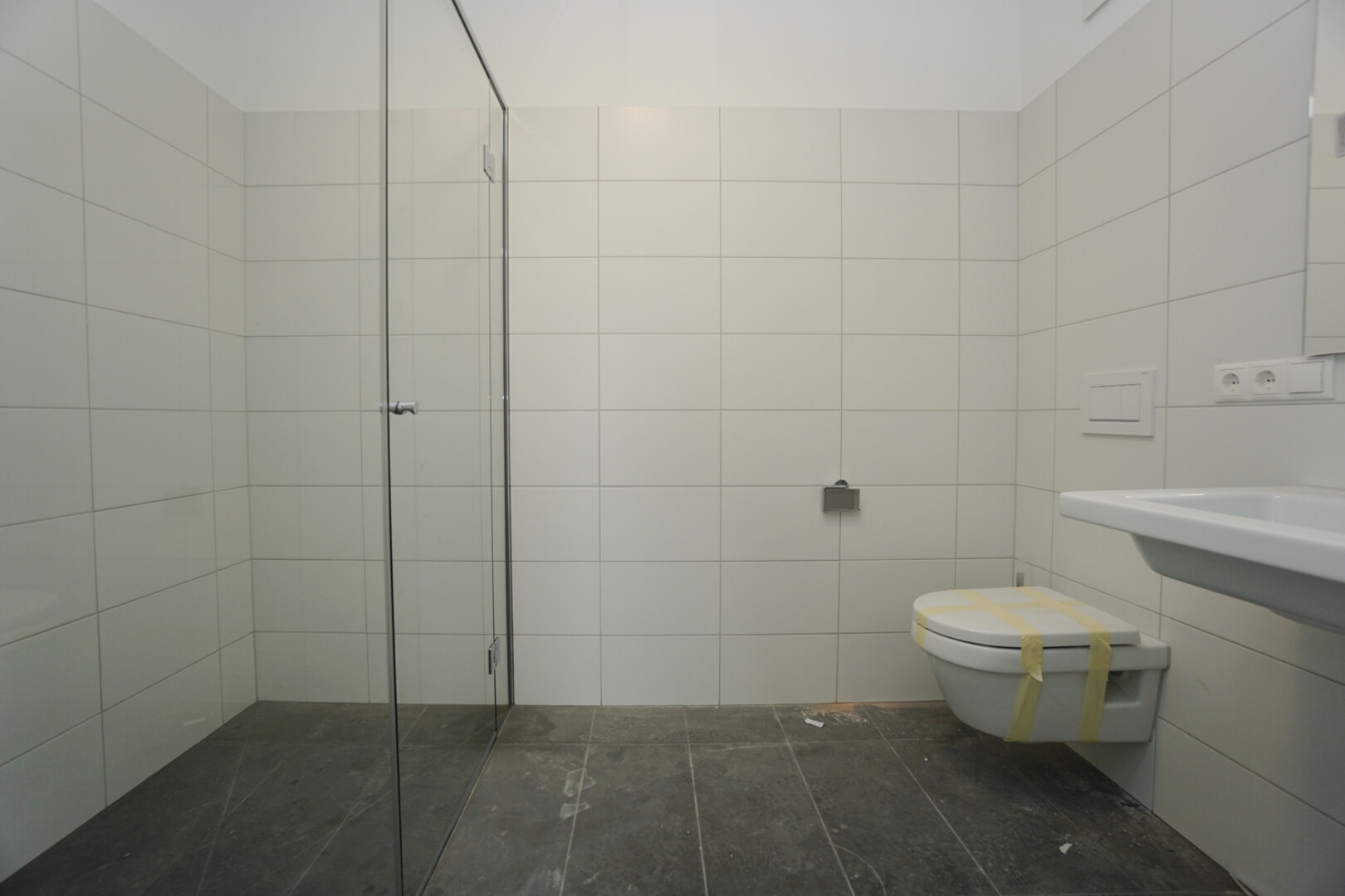 Das Badezimmer ist mit einer begehbaren Dusche, einem WC, einem Waschbeckenverbau ausgestattet.
