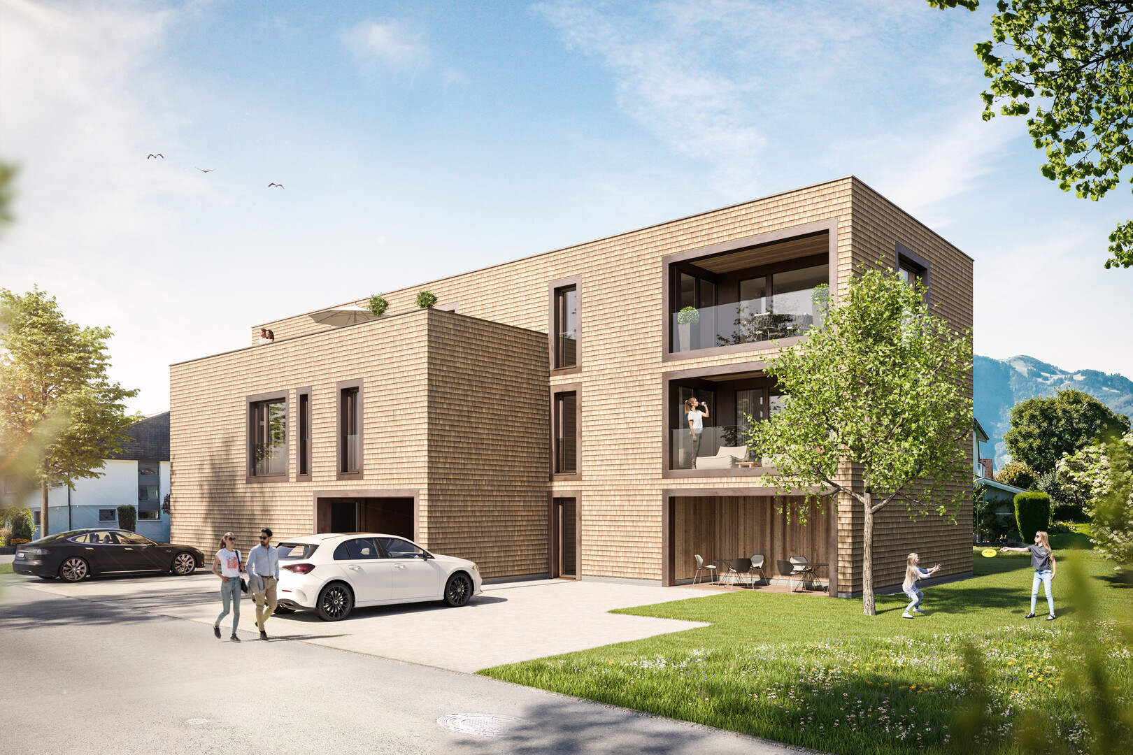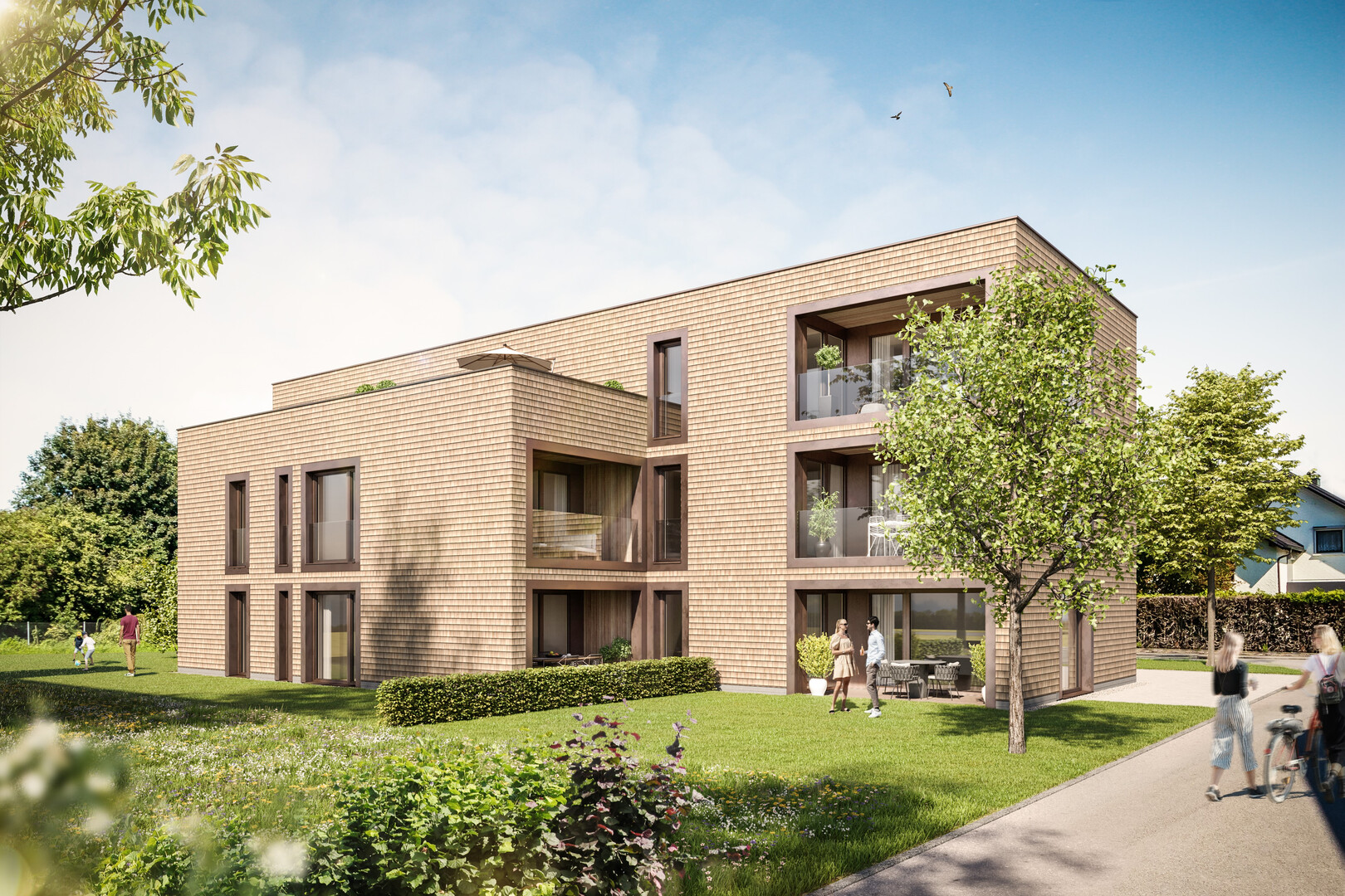 Im Unteren Paspelsweg 6 steht in einer ruhigen Sackgasse ein Green-Building-Ensemble aus 8 Eigentumswohnungen. Hier am Naherholungsgebiet bei den Paspelsseen verschmelzen Natur und Architektur im Drinnen und Draußen. In den gemeinsamen Gärten und in der Panoramasicht auf die Schweizer Berge. Wohnen abseits vom Trubel. Und trotzdem nur 10 Minuten vom Ortskern.