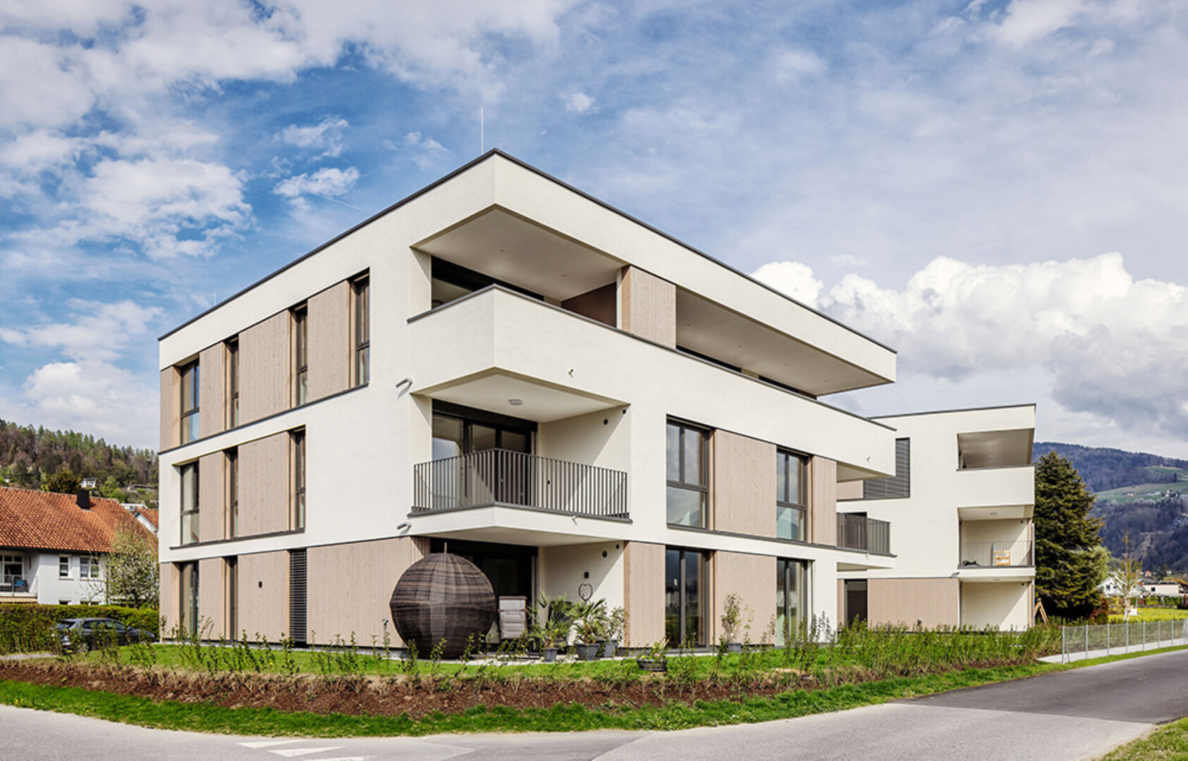 In Klaus hat ZIMA ein modernes Wohnensemble mit klarer Architektur und hochwertigen Materialien realisiert. Die Kombination aus geradlinigem Design und der abwechslungsreichen Fassade aus Putz und Holz verleiht den Gebäuden einen zeitlosen Charakter.