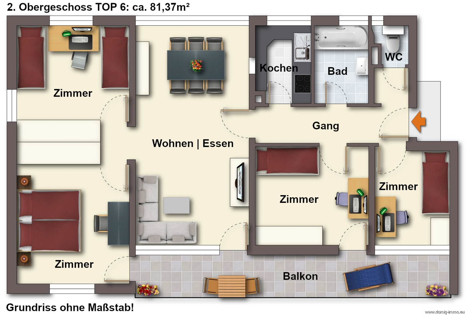 Auf rund 81,37 m² Wohnfläche überzeugt die Wohnung mit einer durchdachten und funktionalen Raumaufteilung. Die vielseitig nutzbaren Zimmer bieten flexible Gestaltungsmöglichkeiten – ideal für Familien, Paare oder auch als attraktive Anlageimmobilie. Der helle Wohnbereich bildet das Herzstück der Wohnung und schafft mit seinem direkten Zugang zum großzügigen Balkon eine besonders angenehme Wohnatmosphäre.