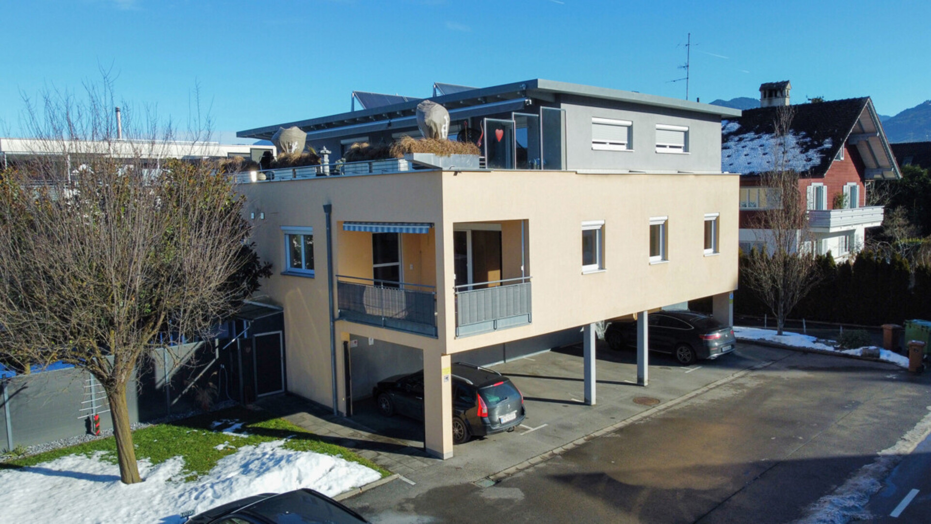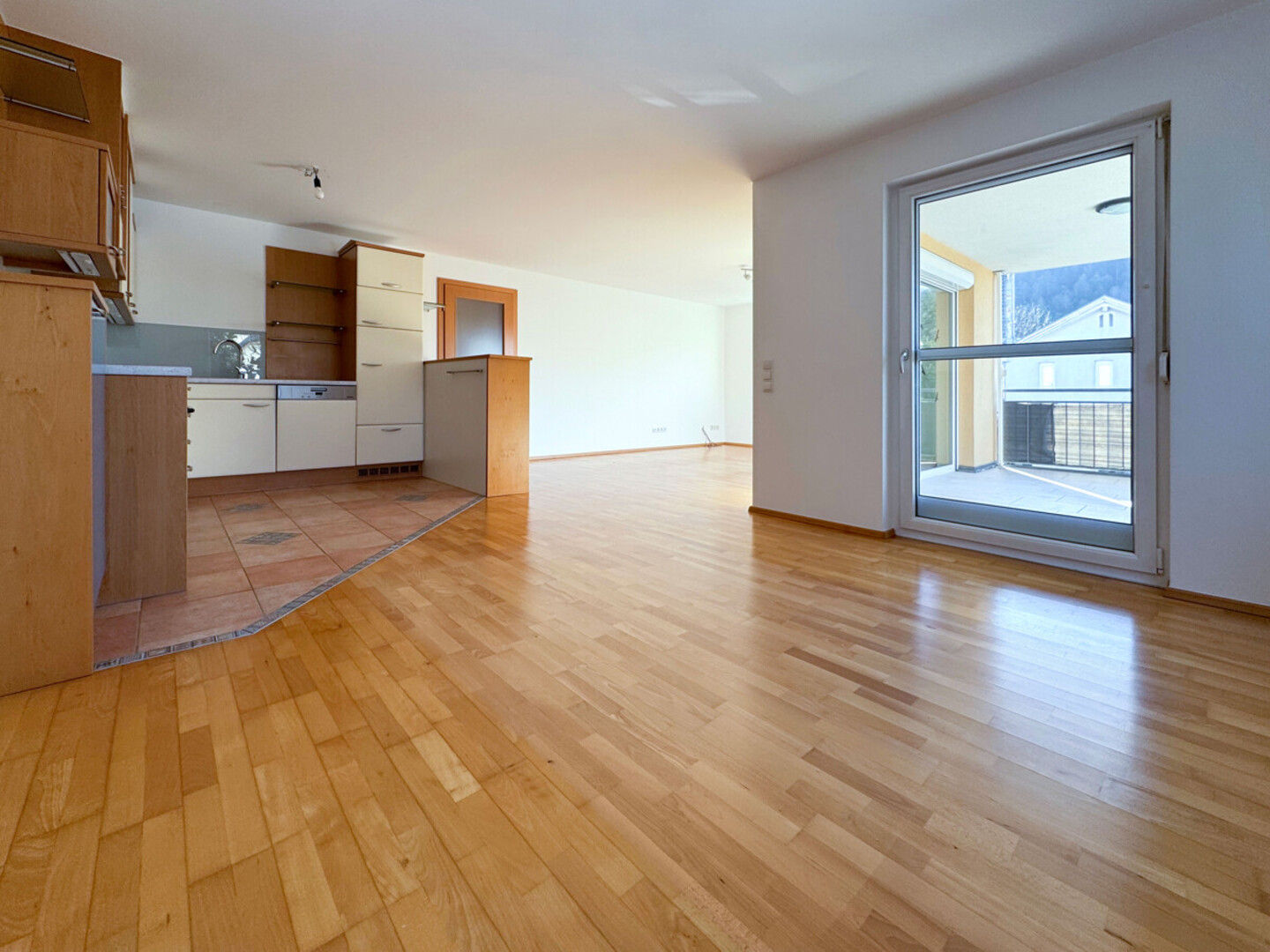 Die 3-Zimmer-Wohnung liegt im 1. Obergeschoss und bietet eine Wohnfläche von rund 79 m². Herzstück der Wohnung ist der offen gestaltete Wohn-, Ess- und Kochbereich mit direktem Zugang zur Terrasse. Eine großzügige Fensterfront sorgt hier für viel Tageslicht und eine angenehme Wohnatmosphäre. Die Terrasse ist nach Süd-Westen ausgerichtet und lädt zu entspannten Stunden im Freien ein. Zwei gut geschnittene Schlafzimmer bieten vielfältige Nutzungsmöglichkeiten. Das Badezimmer ist mit Badewanne, WC sowie einem Waschmaschinenanschluss ausgestattet. Ergänzt wird das Raumangebot durch einen praktischen Abstellraum. Zwei Autoabstellplätze gehören ebenfalls zur Wohnung und runden das Angebot ab.