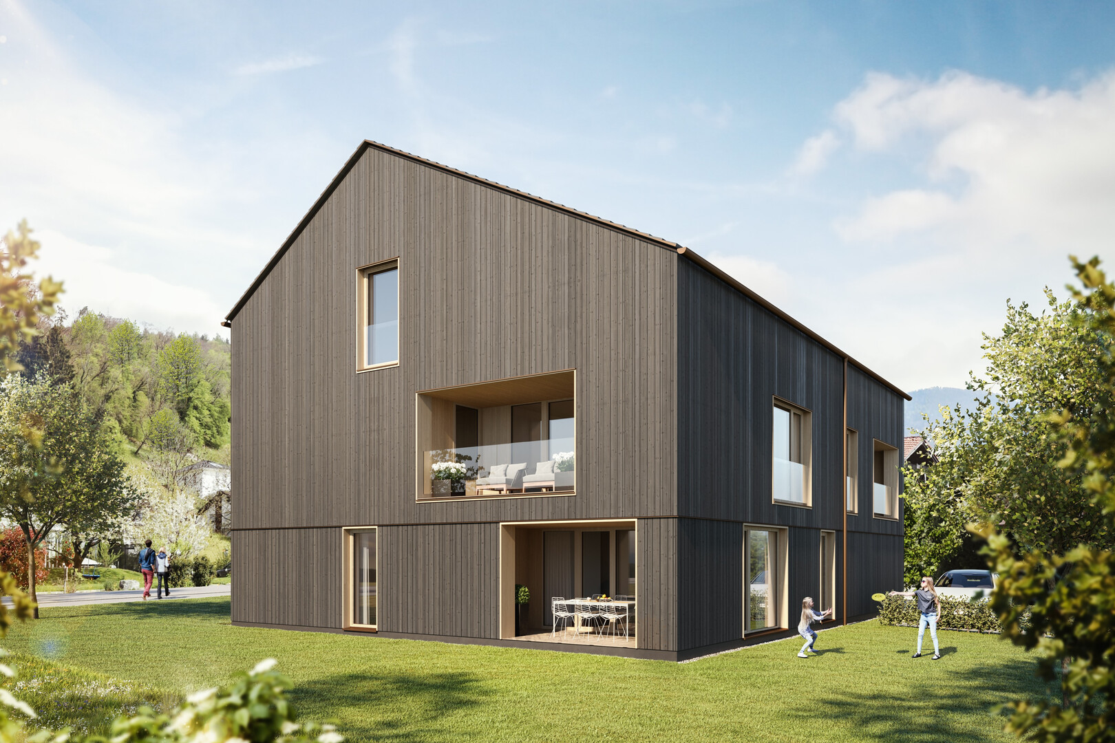 In Klaus steht das von dem Architekten Bernardo Bader geplante, schöne Mehrfamilienhaus welches in Beton und Holzbauweise realisiert wurde. Besondere Priorität wurde auf die Privatsphäre der Bewohner gelegt. Dies zeigt sich insbesondere bei der Anordnung der Loggias der in Summe nur 4 Wohnungseinheiten.