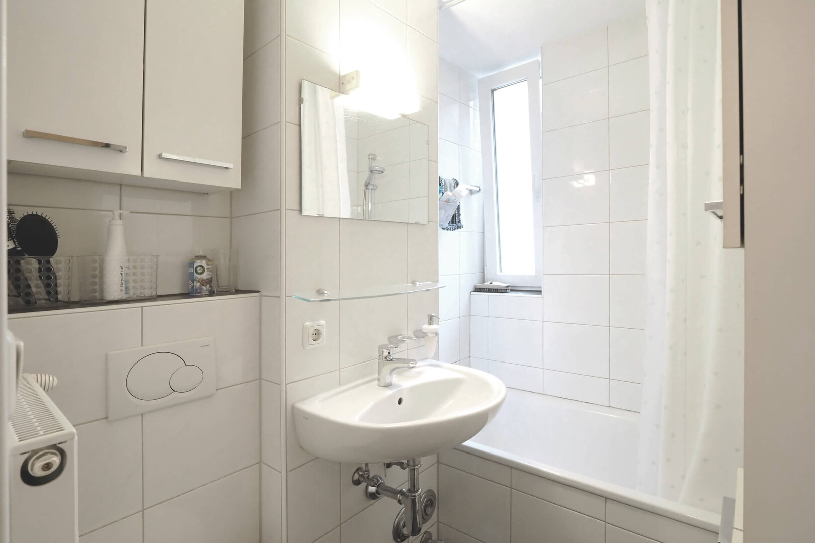 Das Badezimmer ist mit Badewanne, WC und Waschtisch ausgestattet. Das großzügige Schlafzimmer lädt zum Entspannen ein, während zwei weitere Zimmer flexibel als Kinder-, Arbeits- oder Gästezimmer genutzt werden können.