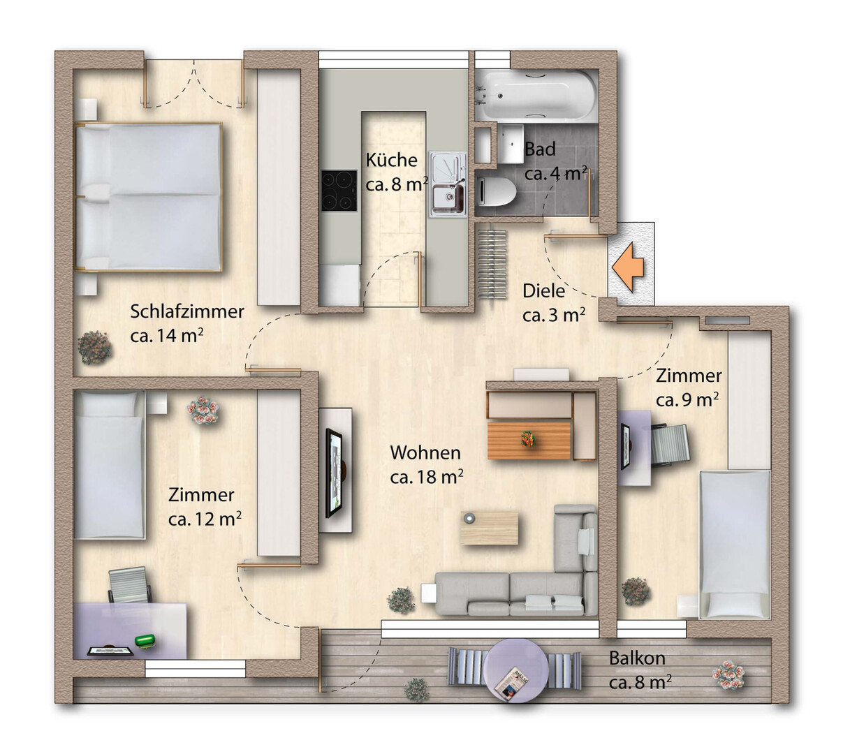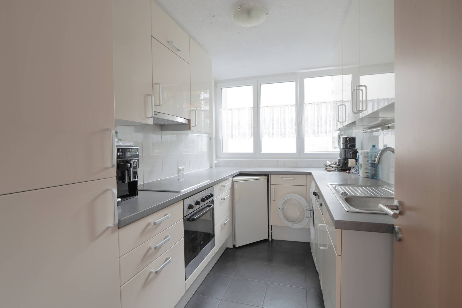 Beim Eintreten empfängt Sie ein freundlicher Eingangsbereich, der in den offenen Wohnraum führt – ein Ort zum Genießen und Beisammensein. Von hier gelangen Sie direkt auf den nach Süden ausgerichteten Balkon. Eine separate Küche mit viel Arbeitsfläche sowie Waschmaschinenanschluss rundet den Wohnbereich ab.