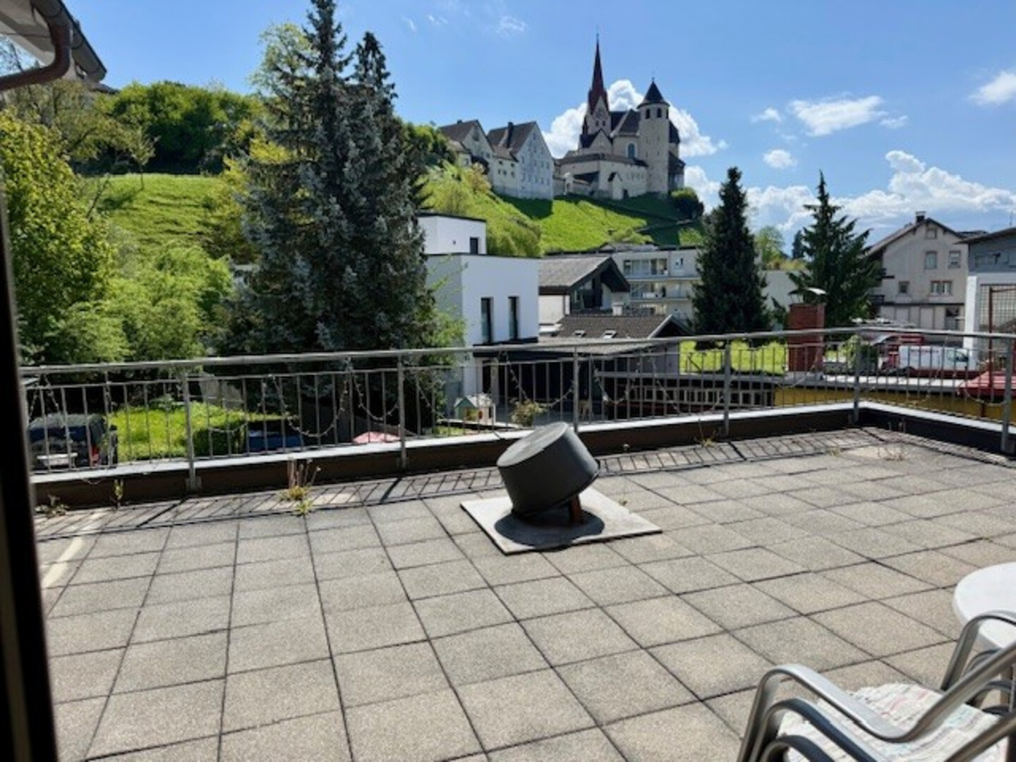 Sowohl von der Küche als auch vom Wohnzimmer gelangen Sie direkt auf die großzügige Terrasse. Hier genießen Sie volle Sonneneinstrahlung sowie einen herrlichen Ausblick auf die Basilika. Eine Markise sorgt bei Bedarf für angenehme Beschattung. Die Terrasse bietet viel Raum für Pflanzen, eine Sitzgarnitur und individuelle Gestaltungsmöglichkeiten - schaffen Sie sich Ihre persönliche Frischluftoase.