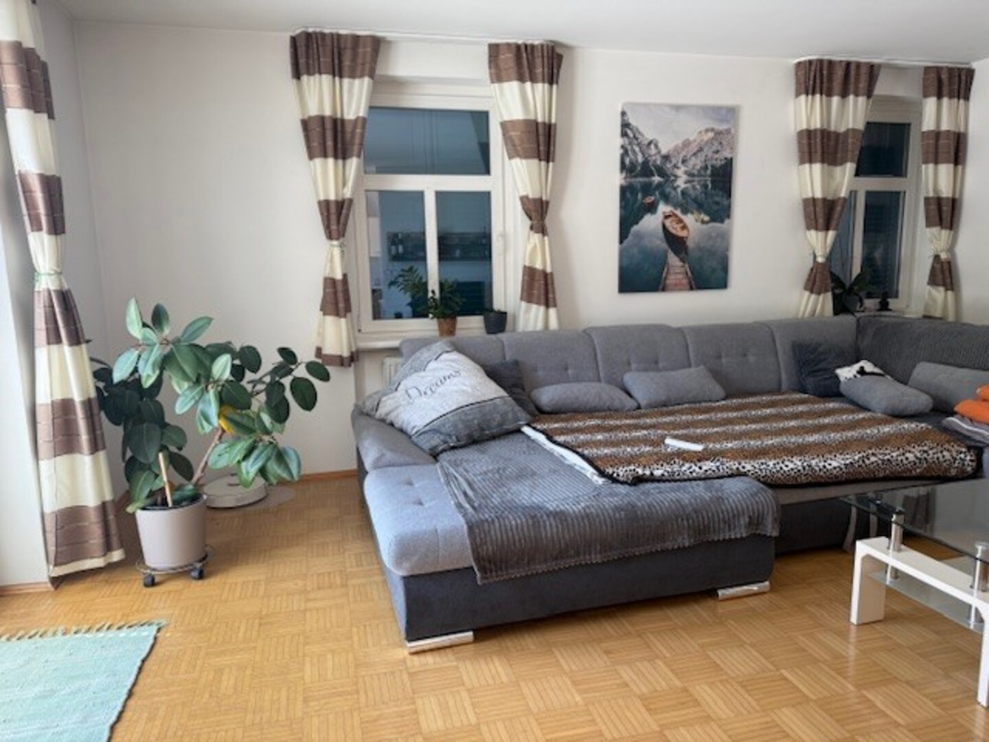 Die durchdachte Raumaufteilung der 3,5-Zimmerwohnung bietet viel Platz zum Wohlfühlen. Der helle Parkettboden erstreckt sich die die gesamte Wohnung und sorgt für eine warme, einladende Atmosphäre - lediglich das Bdezimmer ist mit modernen, weißen Fliesen ausgestattet.