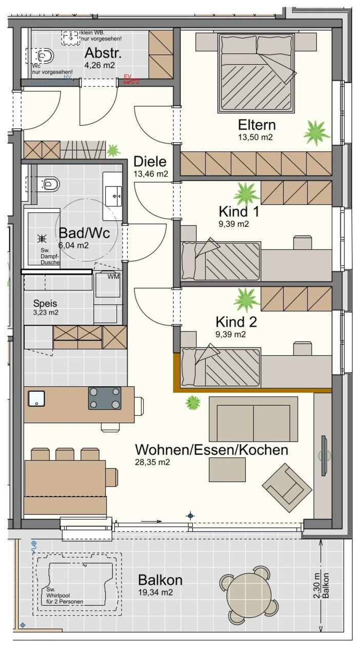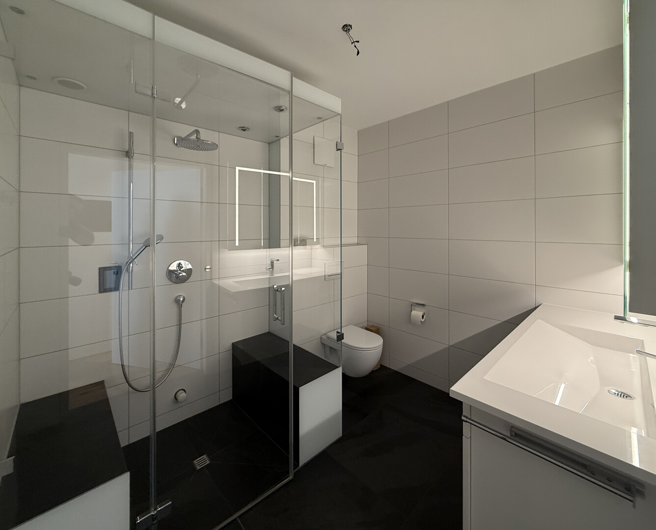 Die Eigentümerin hat die Wohnung wesentlich mitgestaltet und bei der Ausstattung einige Besonderheiten (Dampfdusche, Anschlüsse für Whirlpool auf dem Balkon) vorgesehen.