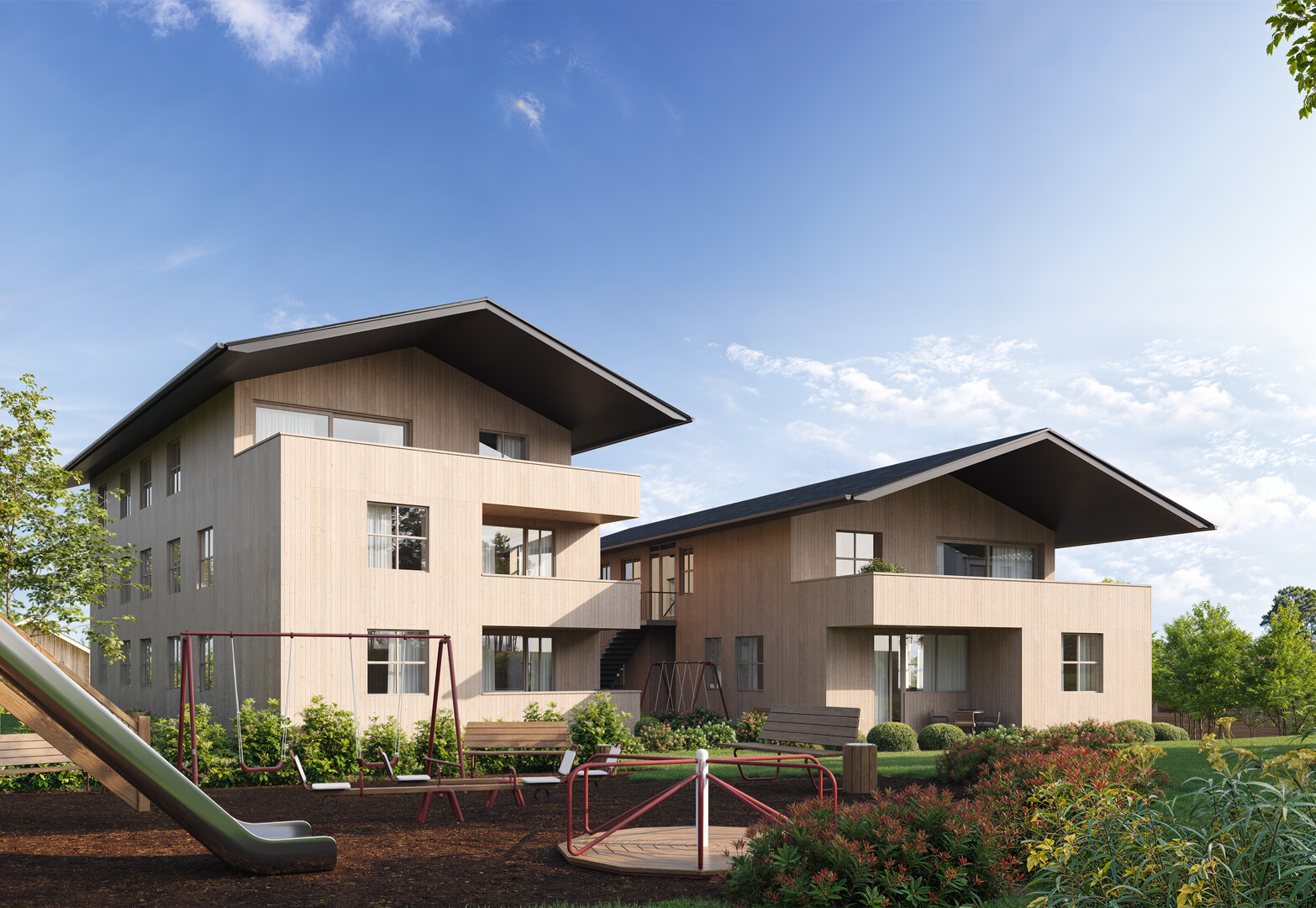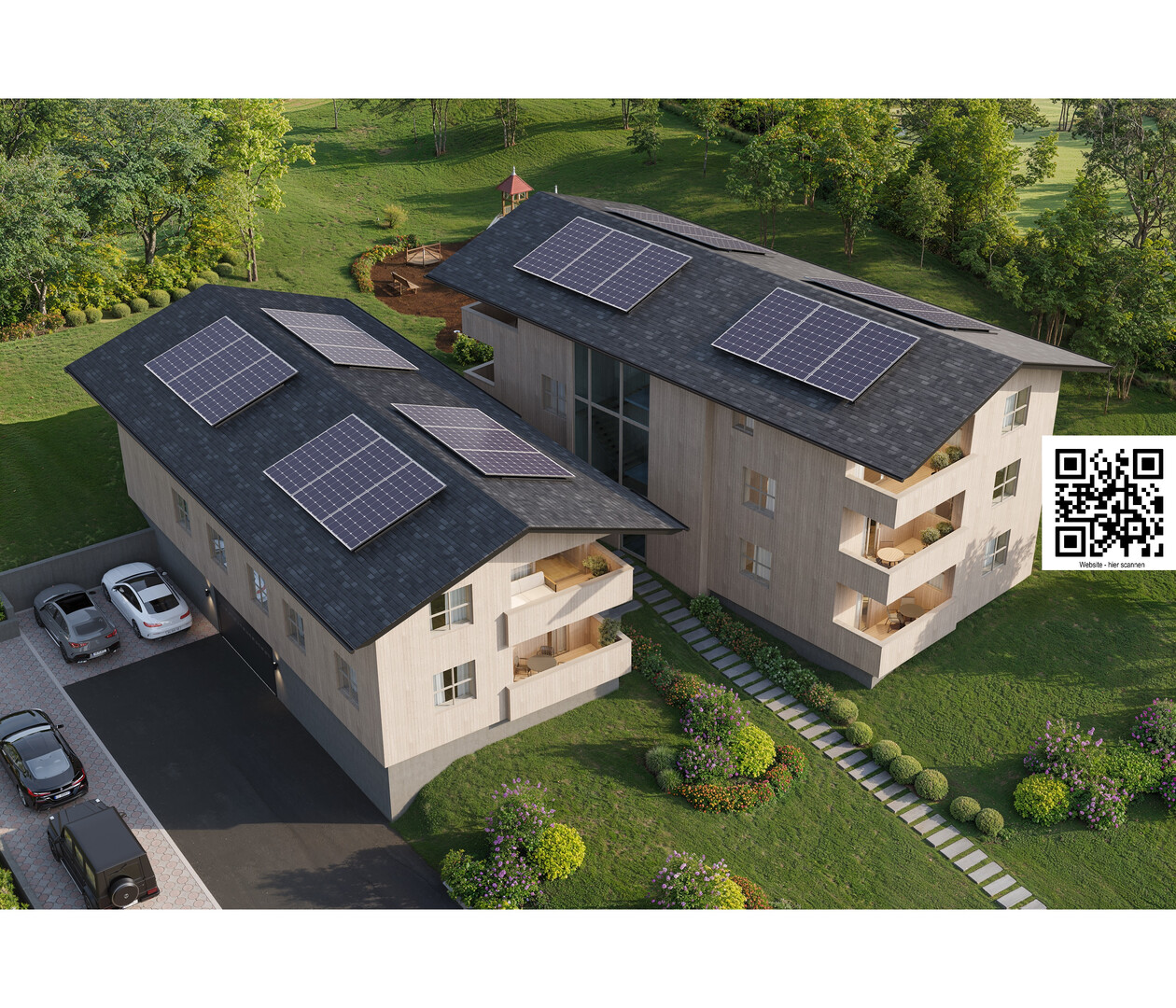 Auch die Allgemeinflächen sind durchdacht konzipiert: Ein Lift, ein Spielplatz sowie ein Gemeinschaftsgarten mit Sitzbereich und Feuerschale fördern ein angenehmes Miteinander. In der Tiefgarage stehen zehn Stellplätze sowie fünf Besucherparkplätze zur Verfügung, eine Vorbereitung für E-Mobilität ist vorgesehen. Das Untergeschoss bietet zudem einen Fahrradraum, Müllraum, Flächen für Motorrad und Moped, einen Technikraum sowie insgesamt zehn Kellerabteile.